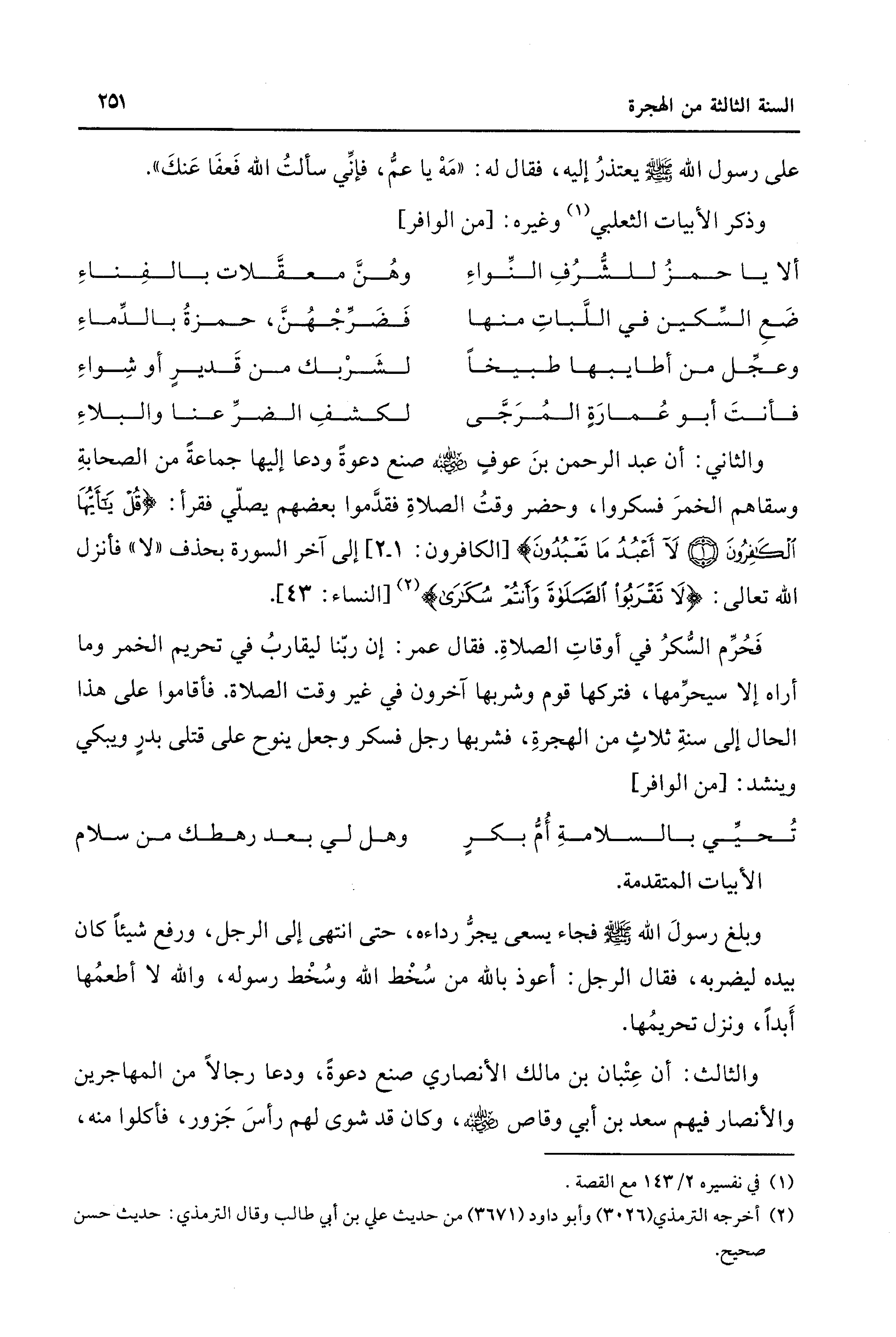 فَحُرِّم السُّكرُ في أوقاتِ الصلاةِ. فقال عمر: إن ربّنا ليقاربُ في تحريم الخمر وما أراه إلا سيحرِّمها، فتركها قوم وشربها آخرون في غير وقت الصلاة. فأقاموا على هذا الحال إلى سنةِ ثلاثٍ من الهجرةِ، فشربها رجل فسكر وجعل ينوح على قتلى بدرٍ ويبكي وينشد: [من الوافر]