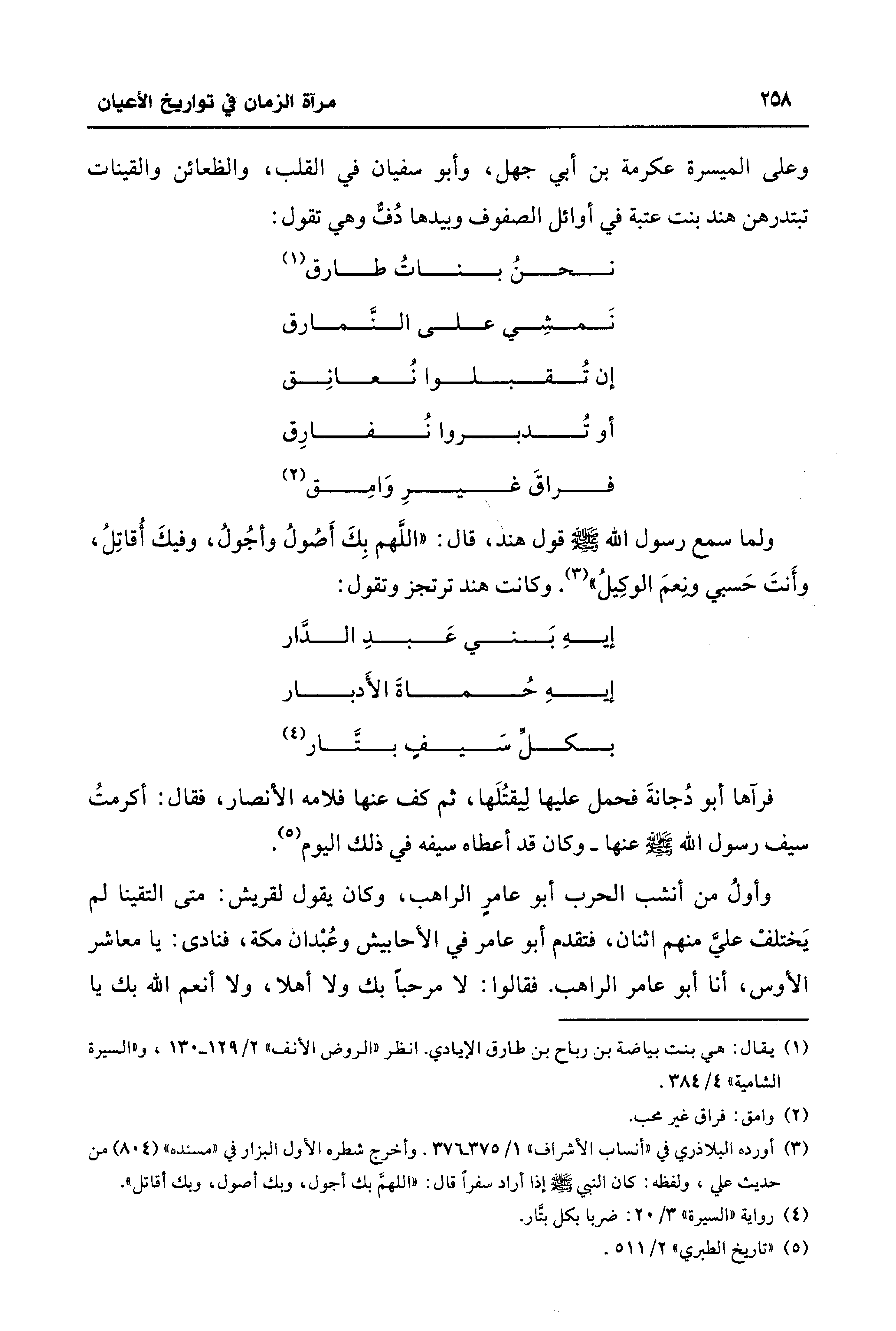 ولما سمع رسول الله - صلى الله عليه وسلم - قول هند، قال: "اللَّهم بِكَ أَصُولُ وأجُولُ، وفيكَ أُقاتِلُ، وأَنتَ حَسبي ونِعمَ الوكِيلُ" (¬3). وكانت هند ترتجز وتقول: