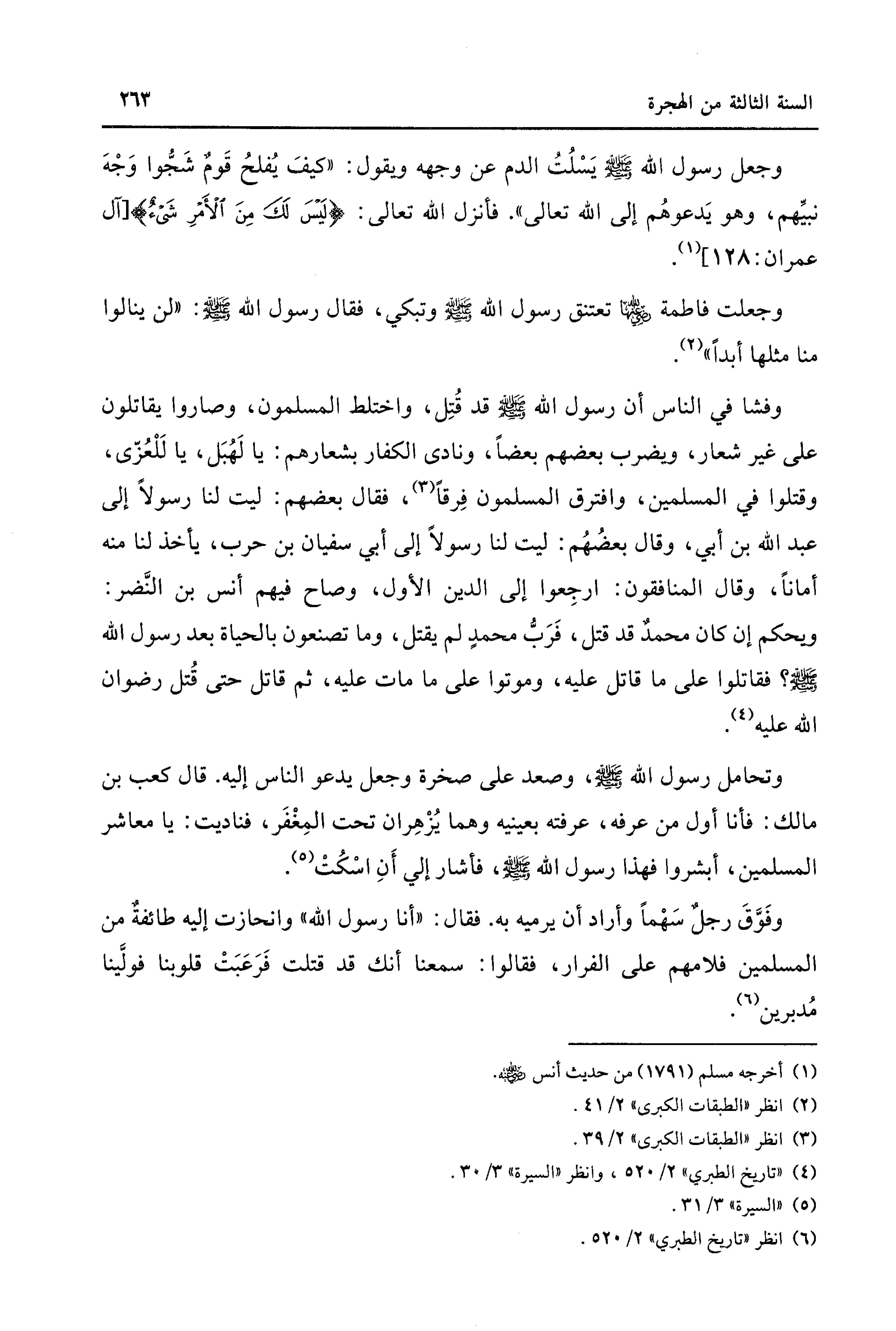 وجعل رسول الله - صلى الله عليه وسلم - يَسْلُت الدم عن وجهه ويقول: "كيفَ يُفلحُ قَومٌ شَجُّوا وَجْهَ نبيِّهم، وهو يَدعوهُم إلى الله تعالى". فأنزل الله تعالى: {لَيسَ لَكَ مِنَ الْأَمْرِ شَيءٌ} [آل عمران: 128] (¬1).