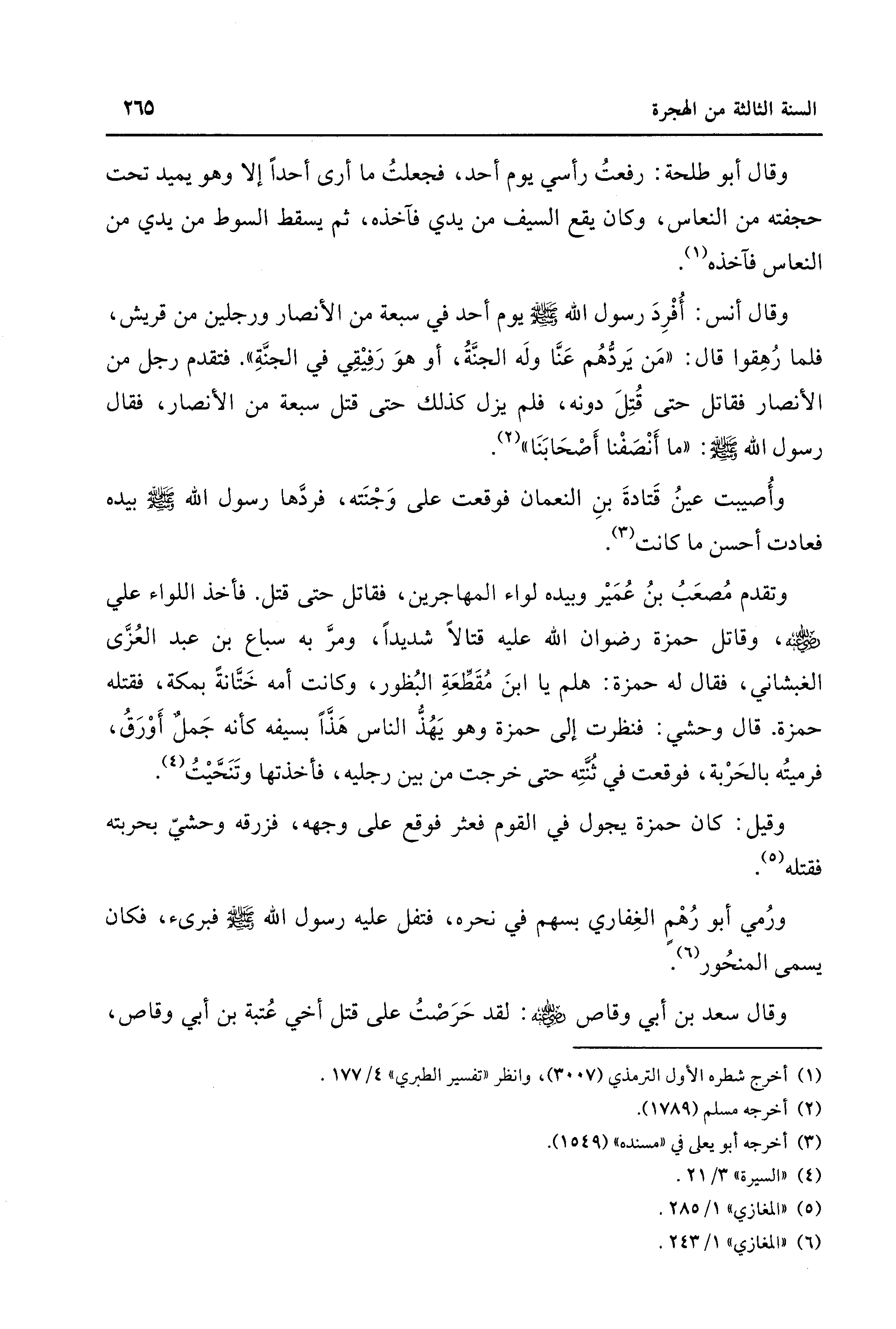 وقال أنس: أُفْرِدَ رسول الله - صلى الله عليه وسلم - يوم أحد في سبعة من الأنصار ورجلين من قريش، فلما رُهِقوا قال: "مَن يَردُّهُم عَنَّا ولَه الجنَّةُ، أو هوَ رَفِيقِي في الجنَّةِ". فتقدم رجل من الأنصار فقاتل حتى قُتِلَ دونه، فلم يزل كذلك حتى قتل سبعة من الأنصار، فقال رسول الله - صلى الله عليه وسلم -: "ما أَنْصَفْنا أَصْحَابَنَا" (¬2).
