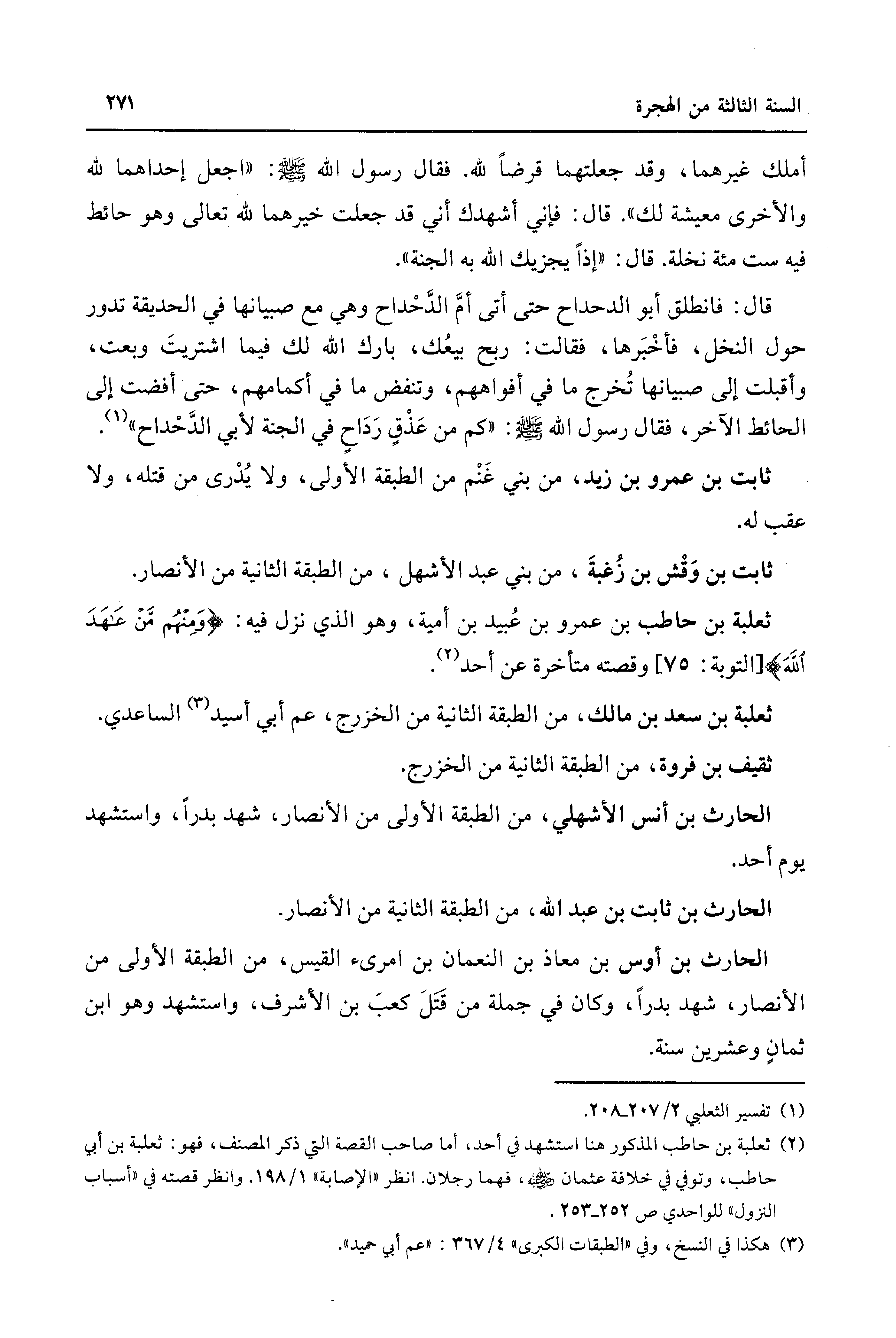 (¬2) ثعلبة بن حاطب المذكور هنا استشهد في أحد، أما صاحب القصة التي ذكر المصنف، فهو: ثعلبة بن أبي حاطب، وتوفي في خلافة عثمان - رضي الله عنه -، فهما رجلان. انظر "الإصابة" 1/ 198. وانظر قصته في "أسباب النزول" للواحدي ص 252 - 253.