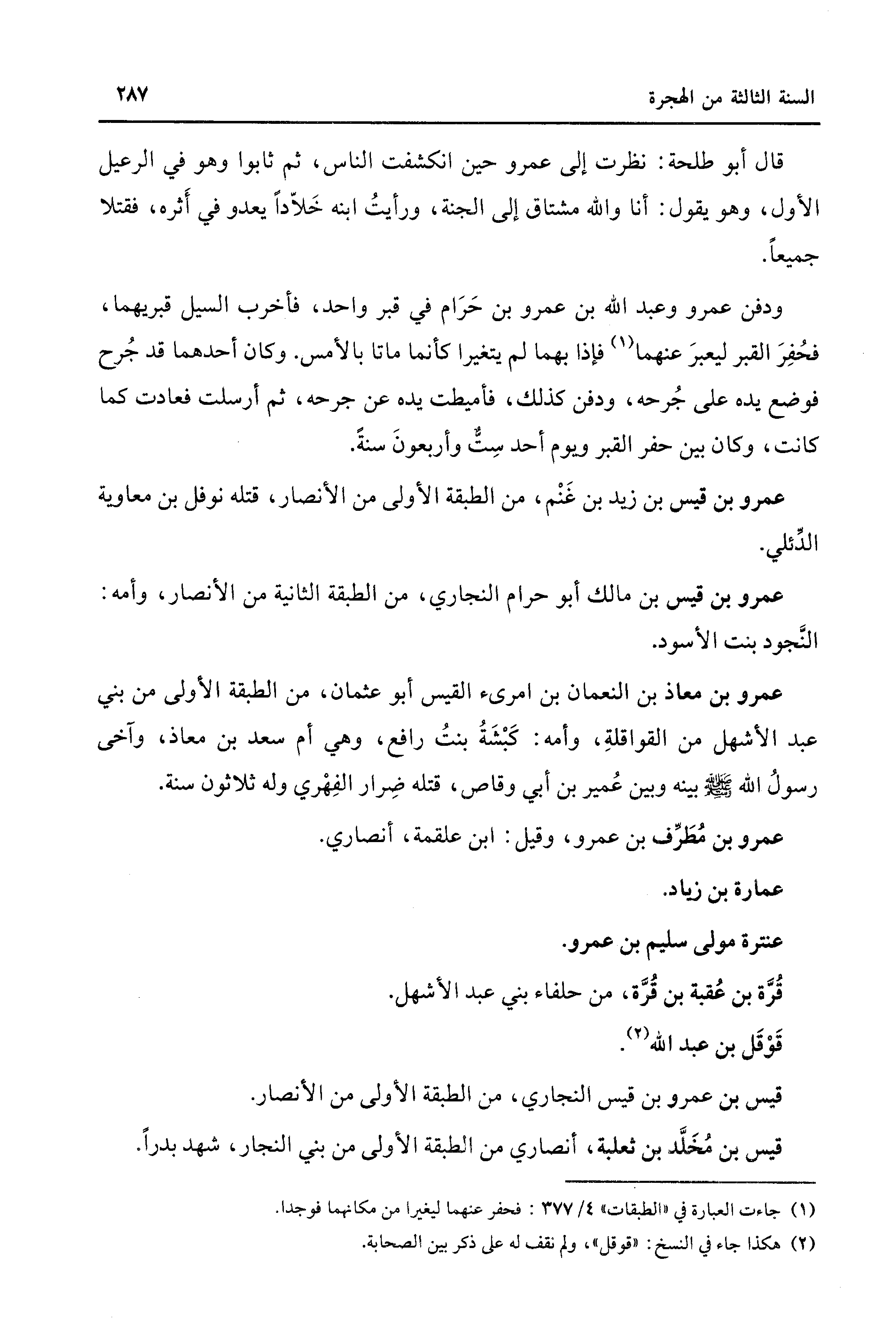 ودفن عمرو وعبد الله بن عمرو بن حَرَام في قبر واحد، فأخرب السيل قبريهما، فحُفِرَ القبر ليعبرَ عنهما (¬1) فإذا بهما لم يتغيرا كأنما ماتا بالأمس. وكان أحدهما قد جُرح فوضع يده على جُرحه، ودفن كذلك، فأميطت يده عن جرحه، ثم أرسلت فعادت كما كانت، وكان بين حفر القبر وبوم أحد سِتٌّ وأربعونَ سنةً.