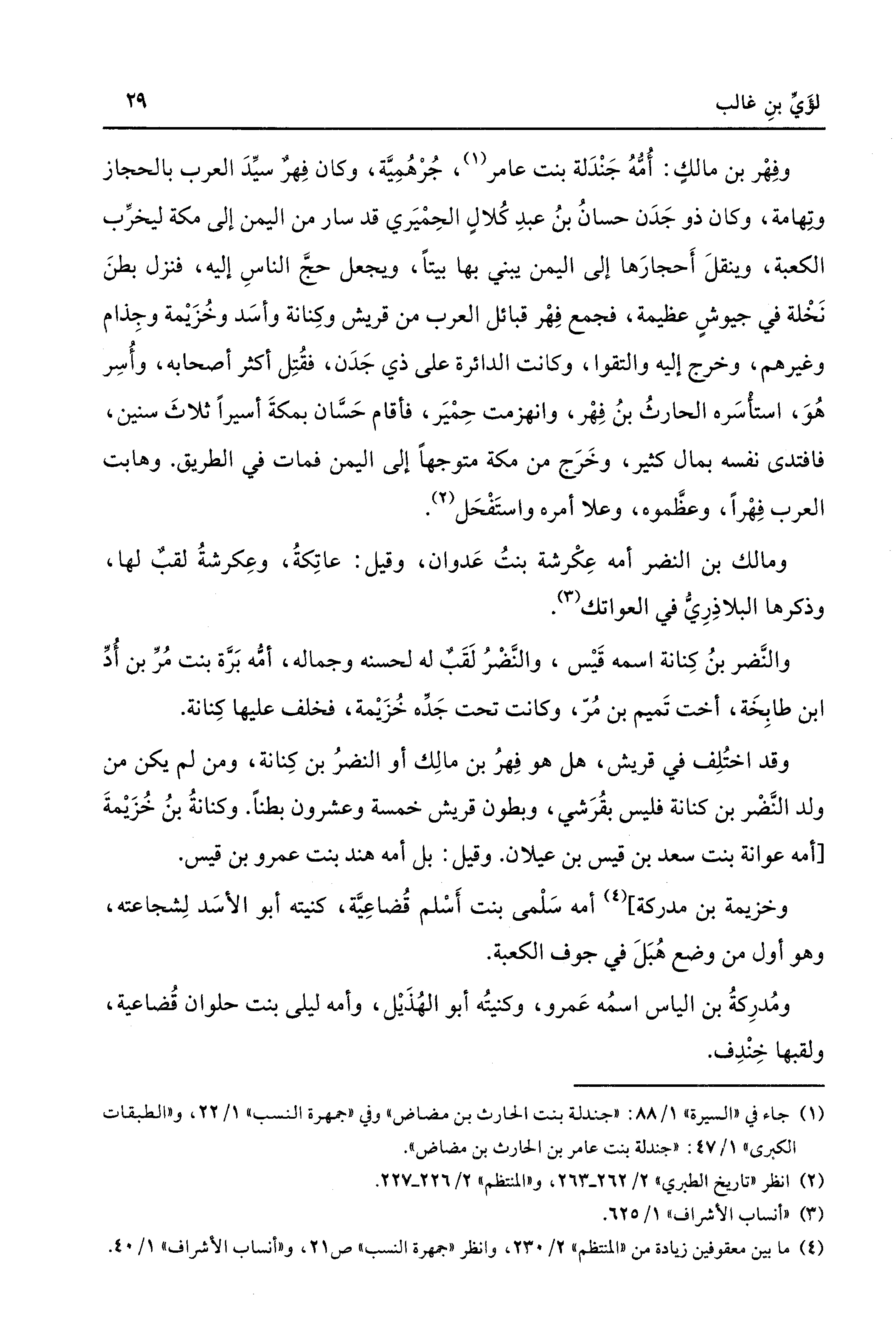 وقد اختُلِف في قريش، هل هو فِهرُ بن مالِك أو النضرُ بن كِنانة، ومن لم يكن من ولد النَّضر بن كنانة فليس بقُرَشي، وبطون قريش خمسة وعشرون بطنًا. وكنانةُ بنُ خُزَيمةَ [أمه عوانة بنت سعد بن قيس بن عيلان. وقيل: بل أمه هند بنت عمرو بن قيس.