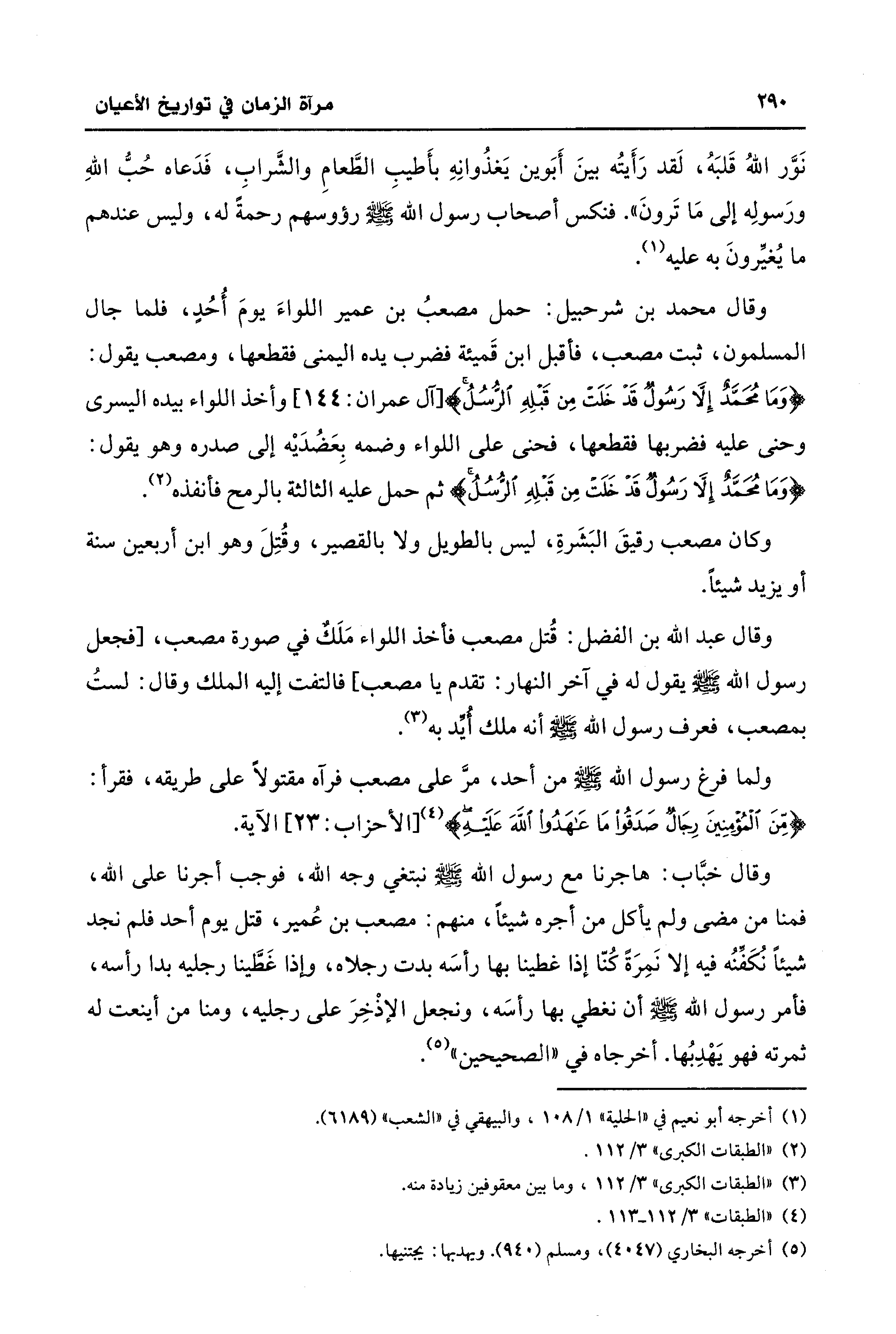 ولما فرغ رسول الله - صلى الله عليه وسلم - من أحد، مرَّ على مصعب فرآه مقتولًا على طريقه، فقرأ: {مِنَ الْمُؤْمِنِينَ رِجَالٌ صَدَقُوا مَا عَاهَدُوا اللَّهَ عَلَيهِ} (¬4) [الأحزاب: 23] الآية.