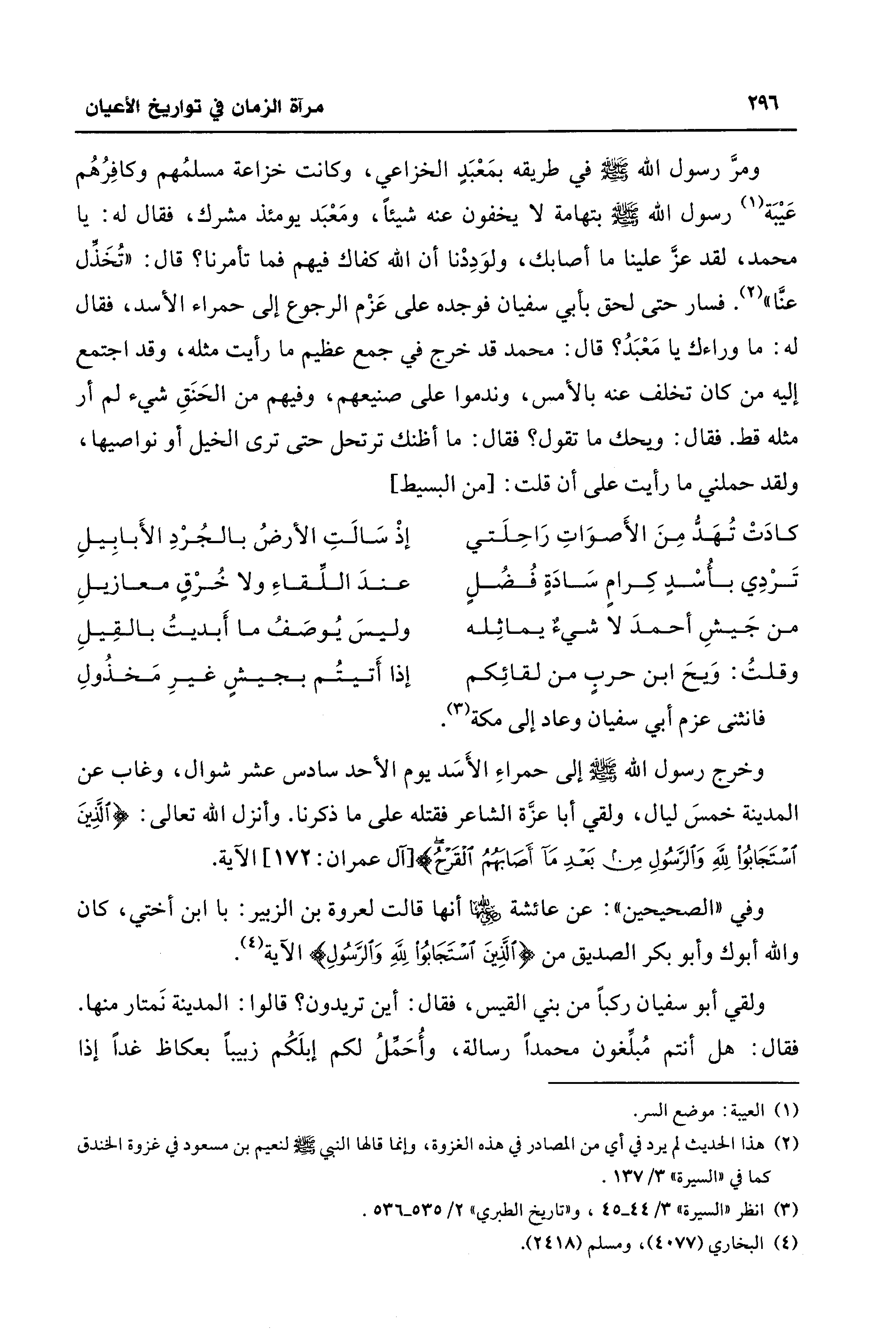 وخرج رسول الله - صلى الله عليه وسلم - إلى حمراءِ الأَسَد يوم الأحد سادس عشر شوال، وغاب عن المدينة خمسَ ليال، ولقي أبا عزَّة الشاعر فقتله على ما ذكرنا. وأنزل الله تعالى: {الَّذِينَ اسْتَجَابُوا لِلَّهِ وَالرَّسُولِ مِنْ بَعْدِ مَا أَصَابَهُمُ الْقَرْحُ} [آل عمران: 172] الآية.