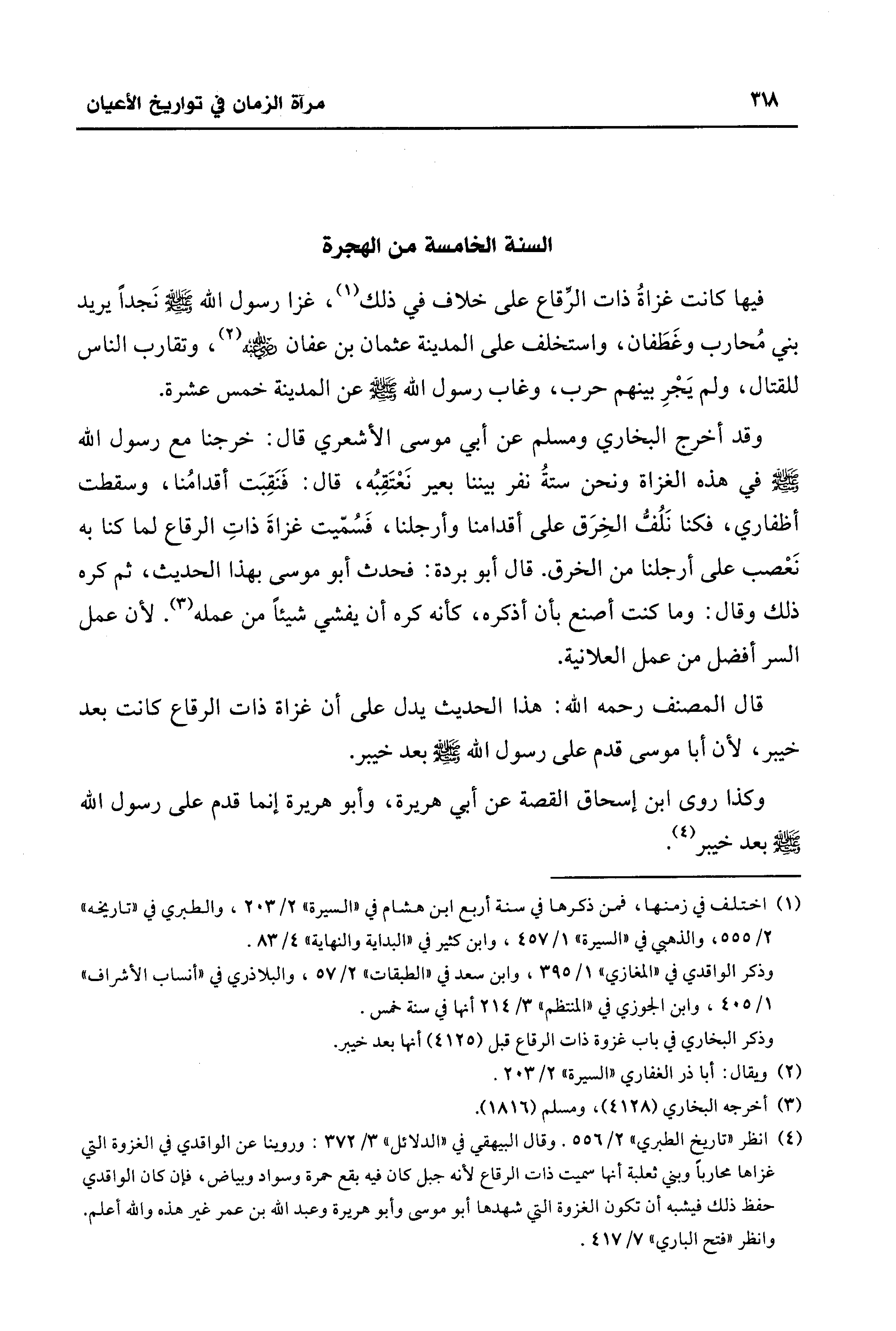 (¬4) انظر "تاريخ الطبري" 2/ 556. وقال البيهقي في "الدلائل" 3/ 372: وروينا عن الواقدي في الغزوة التي غزاها محاربًا وبني ثعلبة أنها سميت ذات الرقاع لأنه جبل كان فيه بقع حمرة وسواد وبياض، فإن كان الواقدي حفظ ذلك فيشبه أن تكون الغزوة التي شهدها أبو موسى وأبو هريرة وعبد الله بن عمر غير هذه والله أعلم. وانظر "فتح الباري" 7/ 417.