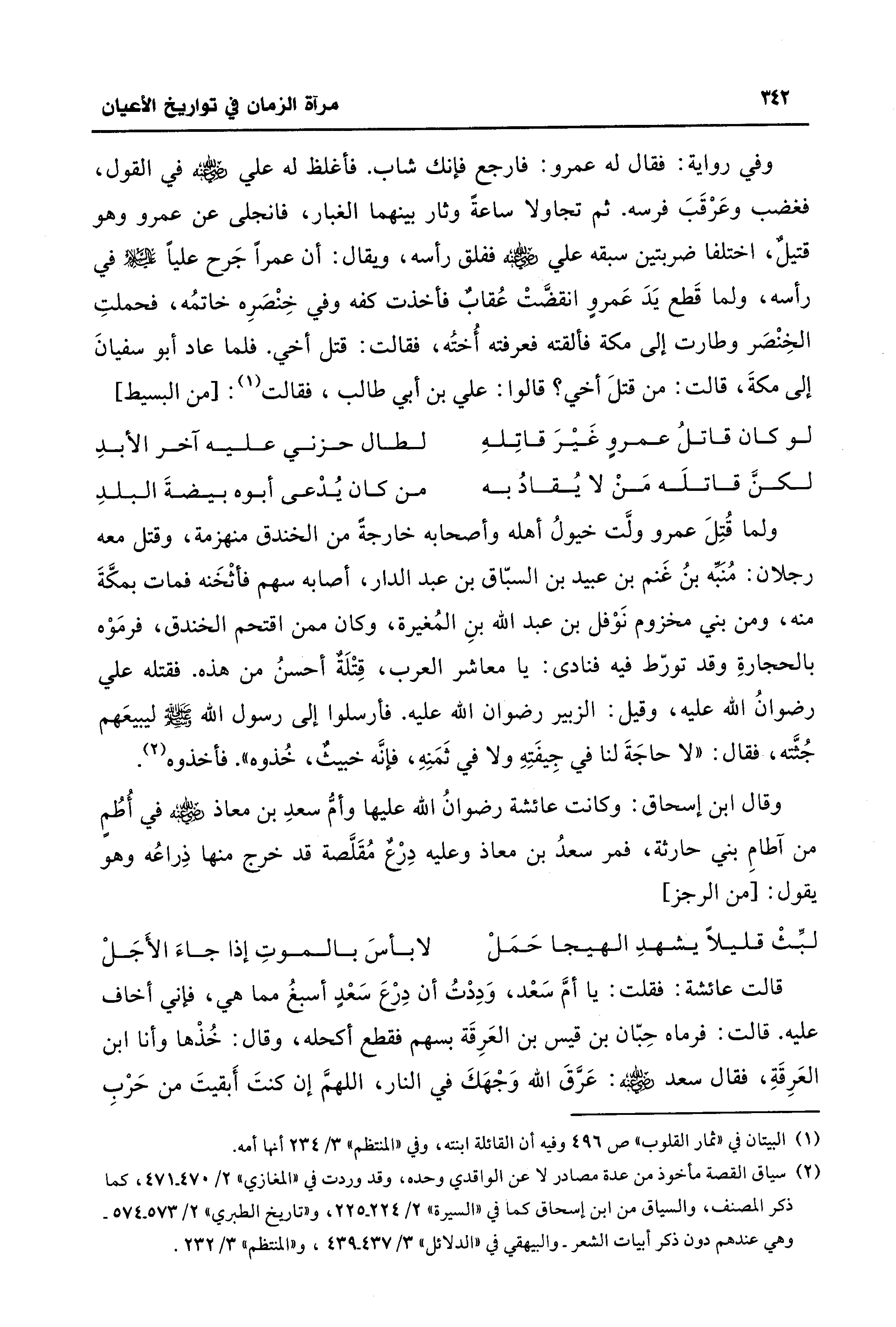 وفي رواية: فقال له عمرو: فارجع فإنك شاب. فأغلظ له علي - رضي الله عنه - في القول، فغضب وعَرْقَبَ فرسه. ثم تجاولا ساعةً وثار بينهما الغبار، فانجلى عن عمرو وهو قتيلٌ، اختلفا ضربتين سبقه علي - رضي الله عنه - ففلق رأسه، ويقال: أن عمرًا جَرح عليًا -- عليه السلام - في رأسه، ولما قَطع يَدَ عَمروٍ انقضَّتْ عُقابٌ فأخذت كفه وفي خِنْصَرِه خاتمُه، فحملتِ الخِنْصَر وطارت إلى مكة فألقته فعرفته أُختُه، فقالت: قتل أخي. فلما عاد أبو سفيانَ إلى مكةَ، قالت: من قتلَ أخي؟ قالوا: علي بن أبي طالب، فقالت (¬1): [من البسيط]