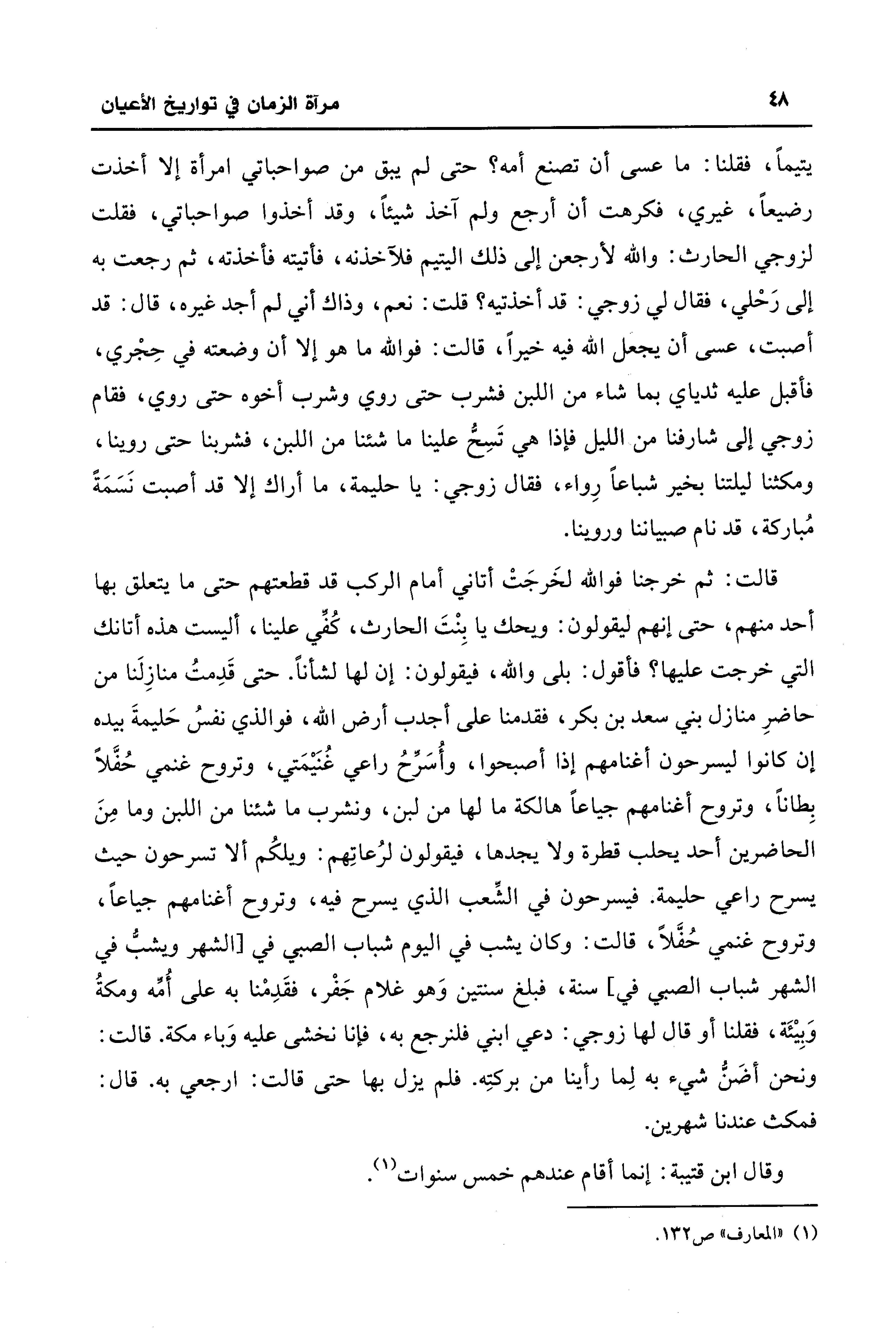 يتيمًا، فقلنا: ما عسى أن تصنع أمه؟ حتى لم يبق من صواحباتي امرأة إلا أخذت رضيعًا، غيري، فكرهت أن أرجع ولم آخذ شيئًا، وقد أخذوا صواحباتي، فقلت لزوجي الحارث: والله لأرجعن إلى ذلك اليتيم فلآخذنه، فأتيته فأخذته، ثم رجعت به إلى رَحْلي، فقال لي زوجي: قد أخذتيه؟ قلت: نعم، وذاك أني لم أجد غيره، قال: قد أصبت، عسى أن يجعل الله فيه خيرًا، قالت: فوالله ما هو إلا أن وضعته في حِجْري، فأقبل عليه ثدياي بما شاء من اللبن فشرب حتى روي وشرب أخوه حتى روي، فقام زوجي إلى شارفنا من الليل فإذا هي تَسِحُّ علينا ما شئنا من اللبن، فشربنا حتى روينا، ومكثنا ليلتنا بخير شباعًا رِواء، فقال زوجي: يا حليمة، ما أراك إلا قد أصبت نَسَمَةً مُباركة، قد نام صبياننا وروينا.