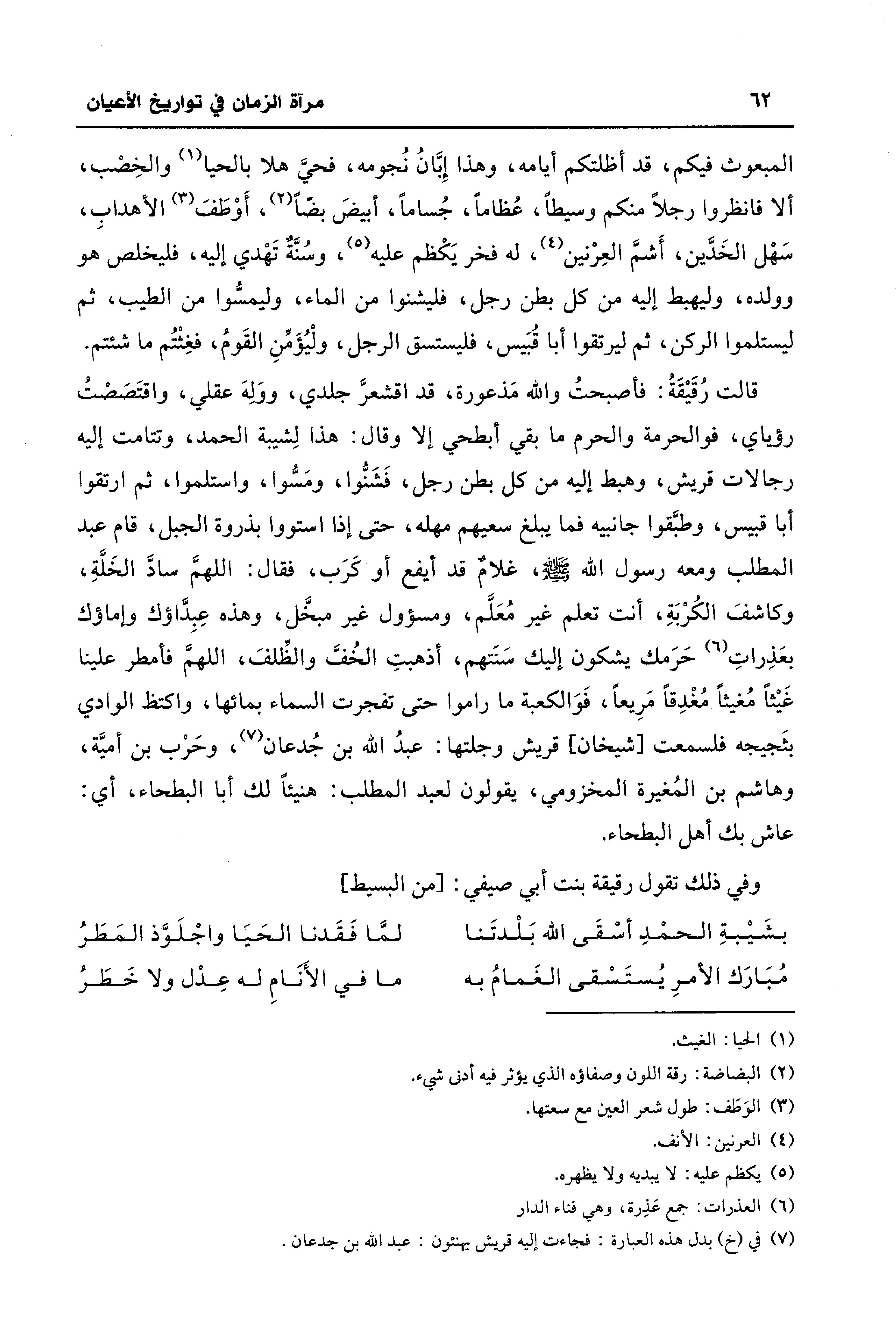 قالت رُقَيْقَةُ: فأصبحتُ والله مَذعورة، قد اقشعرَّ جلدي، ووَلِهَ عقلي، واقتَصَصْتُ رؤياي، فوالحرمة والحرم ما بقي أبطحي إلا وقال: هذا لِشيبة الحمد، وتتامت إليه رجالات قريش، وهبط إليه من كل بطن رجل، فَشَنُّوا، ومَسُّوا، واستلموا، ثم ارتقوا أبا قبيس، وطبَّقوا جانبيه فما يبلغ سعيهم مهله، حتَّى إذا استووا بذروة الجبل، قام عبد المطلب ومعه رسول الله - صلى الله عليه وسلم -، غلامٌ قد أيفع أو كَرَب، فقال: اللهمَّ سادَّ الخَلَّةِ، وكاشفَ الكُرْبَةِ، أنت تعلم غير مُعَلَّم، ومسؤول غير مبخَّل، وهذه عِبِدَّاؤك وإماؤك بعَذِراتِ (¬6) حَرَمك يشكون إليك سَنَتهم، أذهبتِ الخُفَّ والظِّلفَ، اللهمَّ فأمطر علينا غَيثًا مُغيثًا مُغْدِقًا مَرِيعًا، فَوَالكعبة ما راموا حتَّى تفجرت السماء بمائها، واكتظ الوادي بثَجيجه فلسمعت [شيخان] قريش وجلتها: عبدُ الله بن جُدعان (¬7)، وحَرْب بن أميَّة، وهاشم بن المُغيرة المخزومي، يقولون لعبد المطلب: هنيئًا لك أبا البطحاء، أي: عاش بك أهل البطحاء.