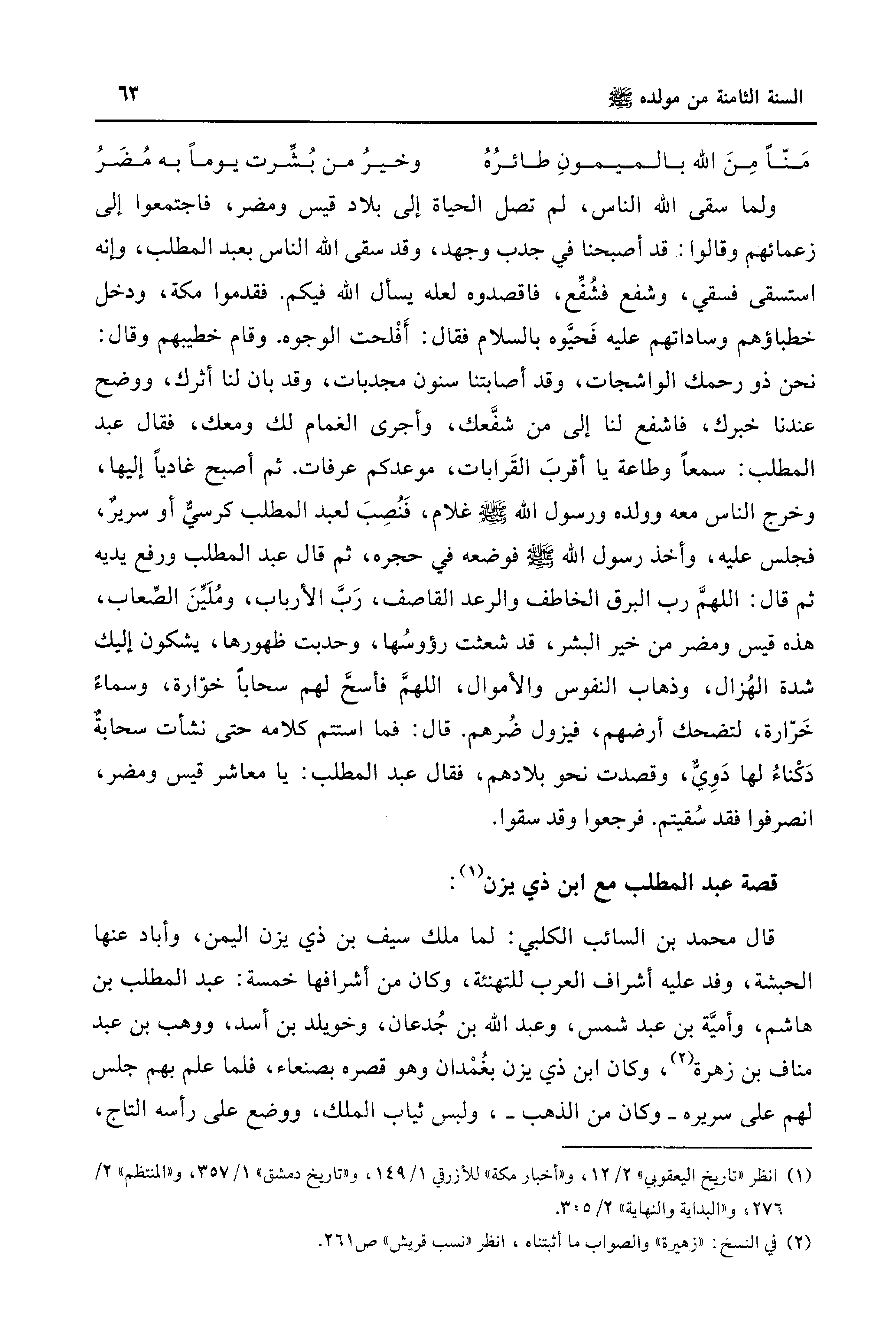 ولما سقى الله الناس، لم تصل الحياة إلى بلاد قيس ومضر، فاجتمعوا إلى زعمائهم وقالوا: قد أصبحنا في جدب وجهد، وقد سقى الله الناس بعبد المطلب، وإنه استسقى فسقي، وشفع فشُفِّع، فاقصدوه لعله يسأل الله فيكم. فقدموا مكة، ودخل خطباؤهم وساداتهم عليه فَحيَّوه بالسلام فقال: أَفْلحت الوجوه. وقام خطيبهم وقال: نحن ذو رحمك الواشجات، وقد أصابتنا سنون مجدبات، وقد بان لنا أثرك، ووضح عندنا خبرك، فاشفع لنا إلى من شفَّعك، وأجرى الغمام لك ومعك، فقال عبد المطلب: سمعًا وطاعة يا أقربَ القَرابات، موعدكم عرفات. ثم أصبح غاديًا إليها، وخرج الناس معه وولده ورسول الله - صلى الله عليه وسلم - غلام، فَنُصِبَ لعبد المطلب كرسيٌّ أو سريرٌ، فجلس عليه، وأخذ رسول الله - صلى الله عليه وسلم - فوضعه في حجره، ثم قال عبد المطلب ورفع يديه ثم قال: اللهمَّ رب البرق الخاطف والرعد القاصف، رَبَّ الأرباب، ومُلَيِّنَ الصِّعاب، هذه قيس ومضر من خير البشر، قد شعثت رؤوسُها، وحدبت ظهورها، يشكون إليك شدة الهُزال، وذهاب النفوس والأموال، اللهمَّ فأسحَّ لهم سحابًا خوّارة، وسماءً خَرّارة، لتضحك أرضهم، فيزول ضُرهم. قال: فما استتم كلامه حتَّى نشأت سحابةٌ دَكْناءُ لها دَويٌّ، وقصدت نحو بلادهم، فقال عبد المطلب: يا معاشر قيس ومضر، انصرفوا فقد سُقيتم. فرجعوا وقد سقوا.