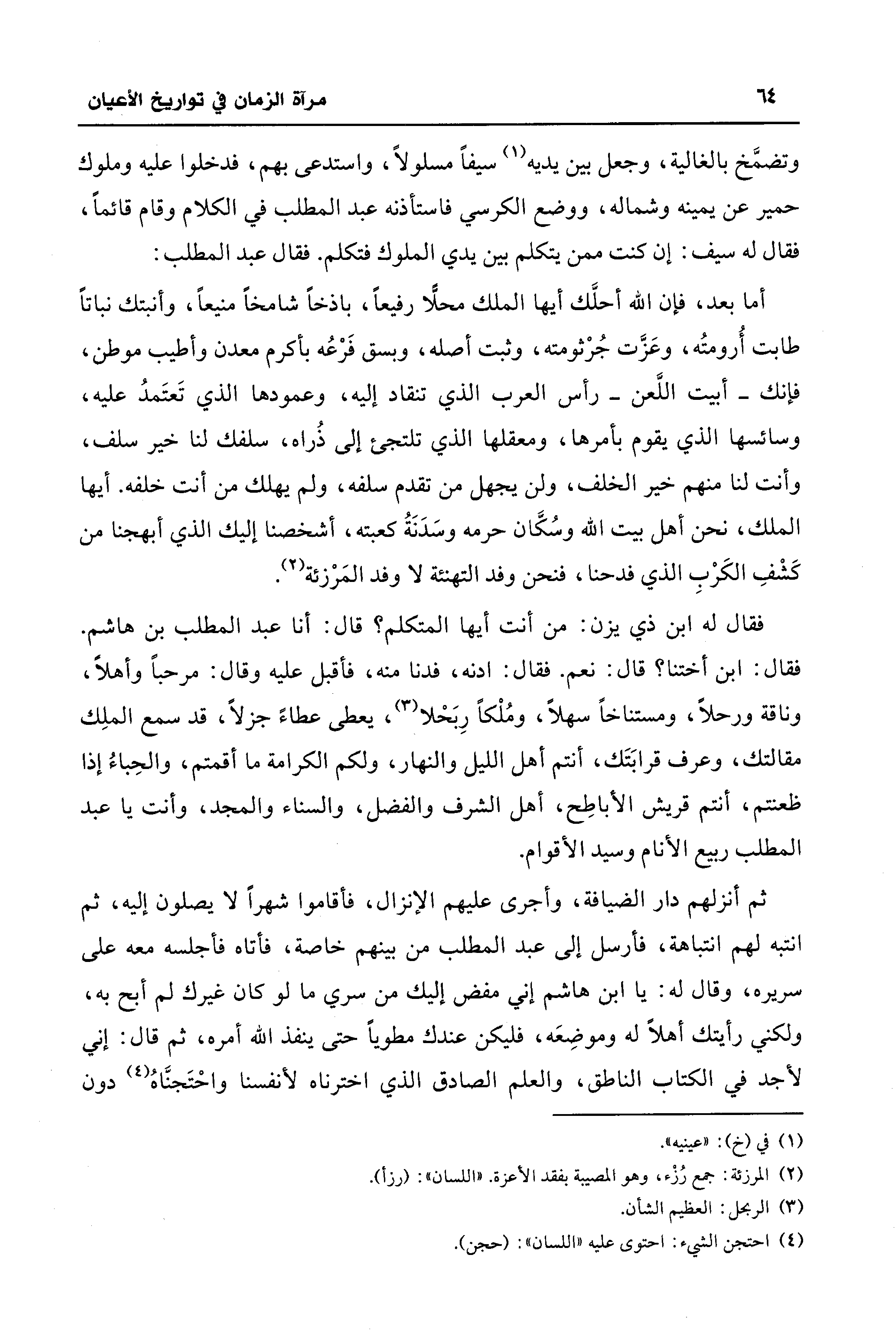 وتضمَّخ بالغالية، وجعل بين يديه (¬1) سيفًا مسلولًا، واستدعى بهم، فدخلوا عليه وملوك حمير عن يمينه وشماله، ووضع الكرسي فاستأذنه عبد المطلب في الكلام وقام قائمًا، فقال له سيف: إن كنت ممن يتكلم بين يدي الملوك فتكلم. فقال عبد المطلب: