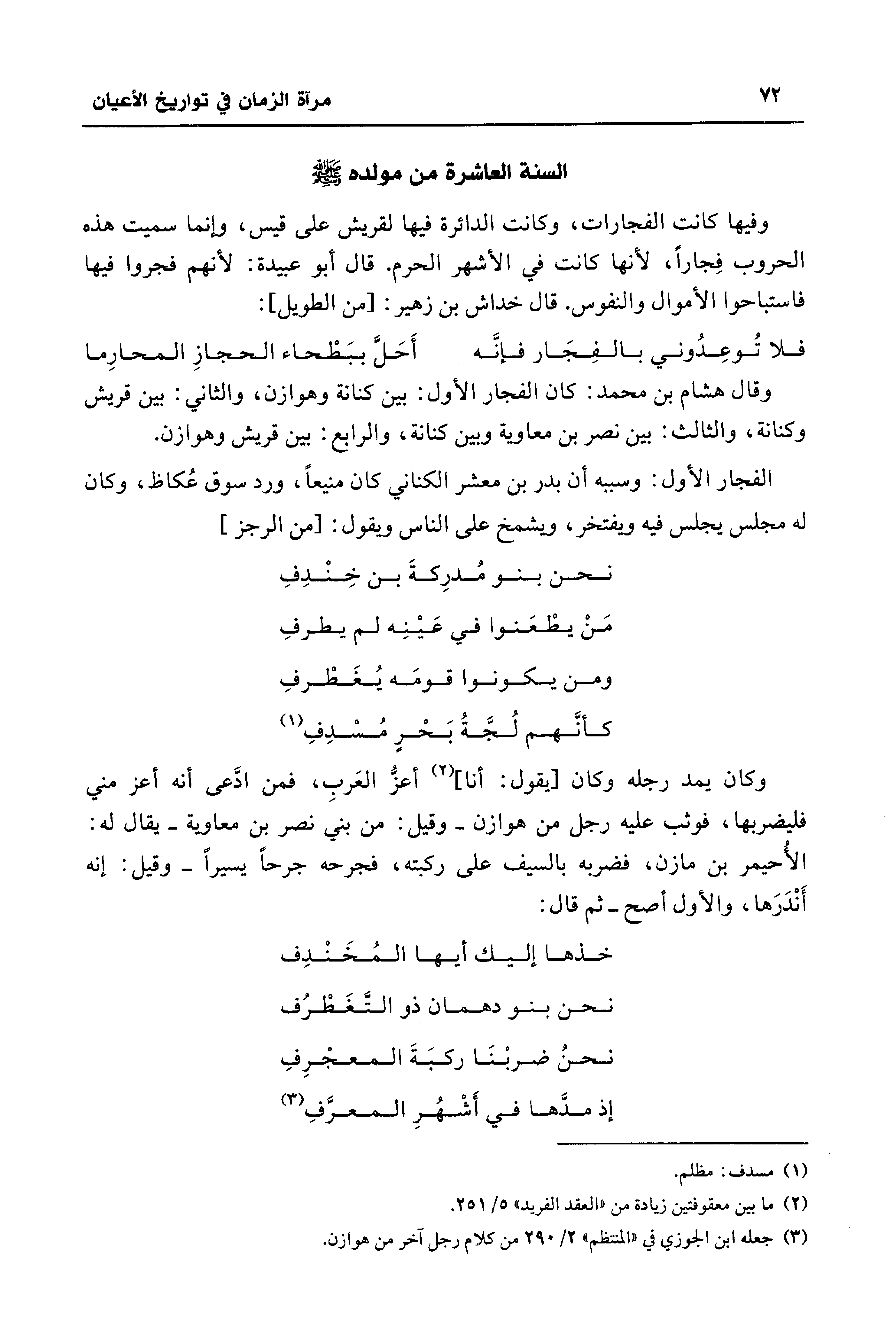 وفيها كانت الفجارات، وكانت الدائرة فيها لقريش على قيس، وإنما سميت هذه الحروب فِجارًا، لأنها كانت في الأشهر الحرم. قال أبو عبيدة: لأنهم فجروا فيها فاستباحوا الأموال والنفوس. قال خداش بن زهير: [من الطويل]