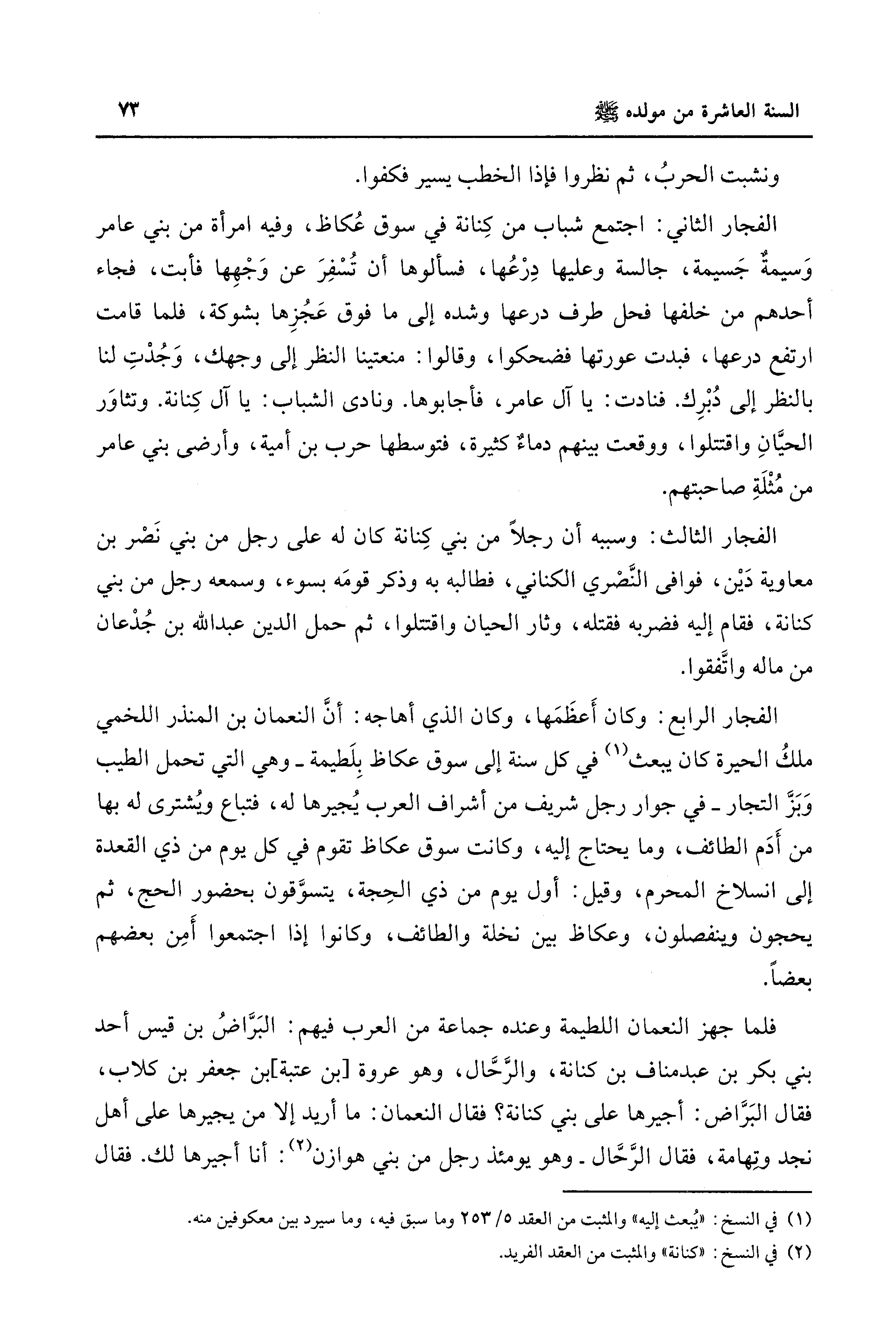 الفجار الرابع: وكان أَعظَمَها، وكان الَّذي أهاجه: أنَّ النعمان بن المنذر اللخمي ملكُ الحيرة كان يبعث (¬1) في كل سنة إلى سوق عكاظ بِلَطيمة -وهي التي تحمل الطيب وَبَزَّ التجار- في جوار رجل شريف من أشراف العرب يُجيرها له، فتباع ويشترى له بها من أَدَم الطائف، وما يحتاج إليه، وكانت سوق عكاظ تقوم في كل يوم من ذي القعدة إلى انسلاخ المحرم، وقيل: أول يوم من ذي الحِجة، يتسوَّقون بحضور الحج، ثم يحجون وينفصلون، وعكاظ بين نخلة والطائف، وكانوا إذا اجتمعوا أَمِن بعضهم بعضًا.