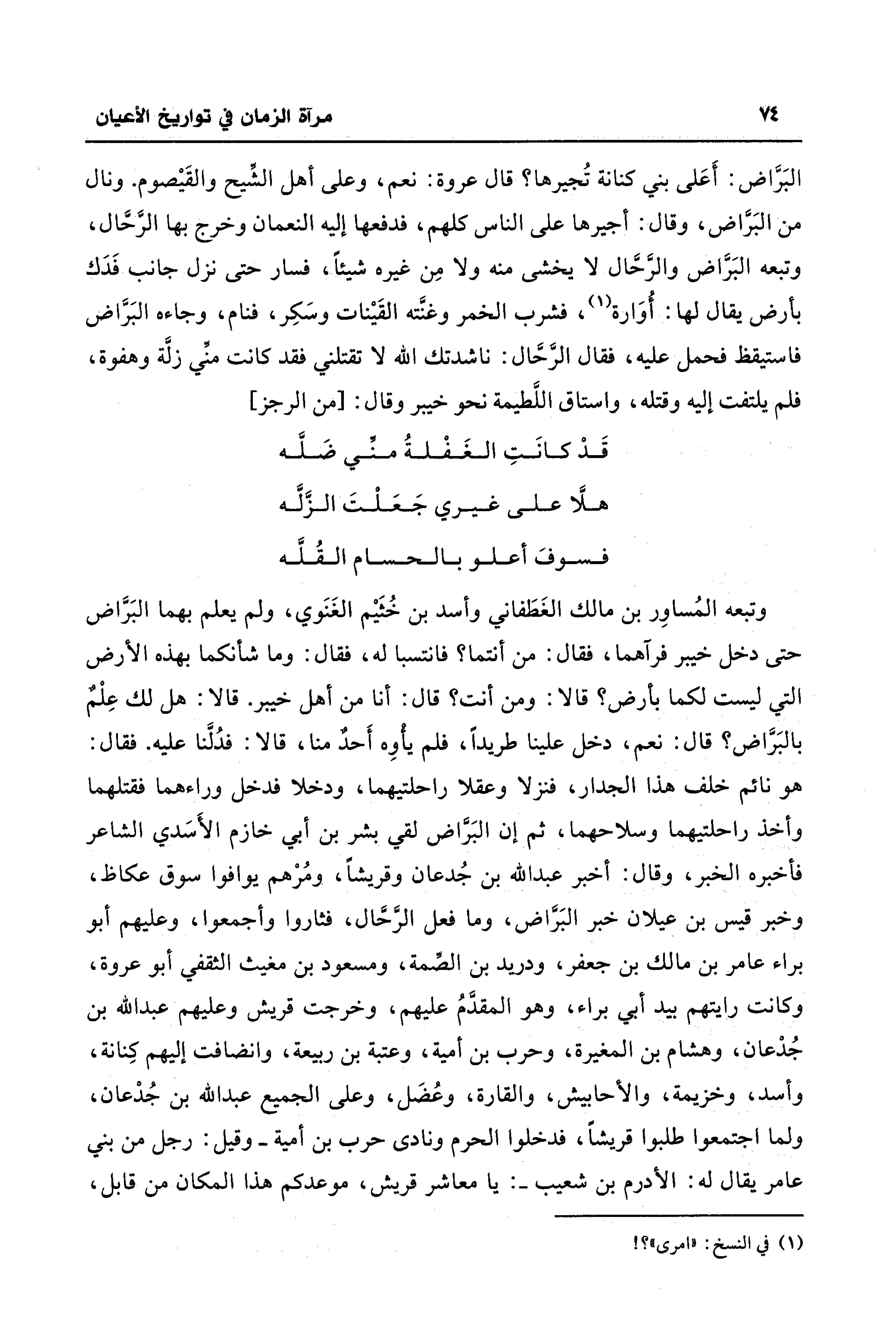 البَرَّاض: أَعَلى بني كنانة تُجيرها؟ قال عروة: نعم، وعلى أهل الشِّيح والقَيْصوم. ونال من البَرَّاض، وقال: أجيرها على الناس كلهم، فدفعها إليه النعمان وخرج بها الرَّحَّال، وتبعه البَرَّاض والرَّحَّال لا يخشى منه ولا مِن غيره شيئًا، فسار حتَّى نزل جانب فَدَك بأرض يقال لها: أُوَارة (¬1)، فشرب الخمر وغنَّته القَينات وسَكِر، فنام، وجاءه البَرَّاض فاستيقظ فحمل عليه، فقال الرَّحَّال: ناشدتك الله لا تقتلني فقد كانت منِّي زلَّة وهفوة، فلم يلتفت إليه وقتله، واستاق اللَّطيمة نحو خيبر وقال: [من الرجز]