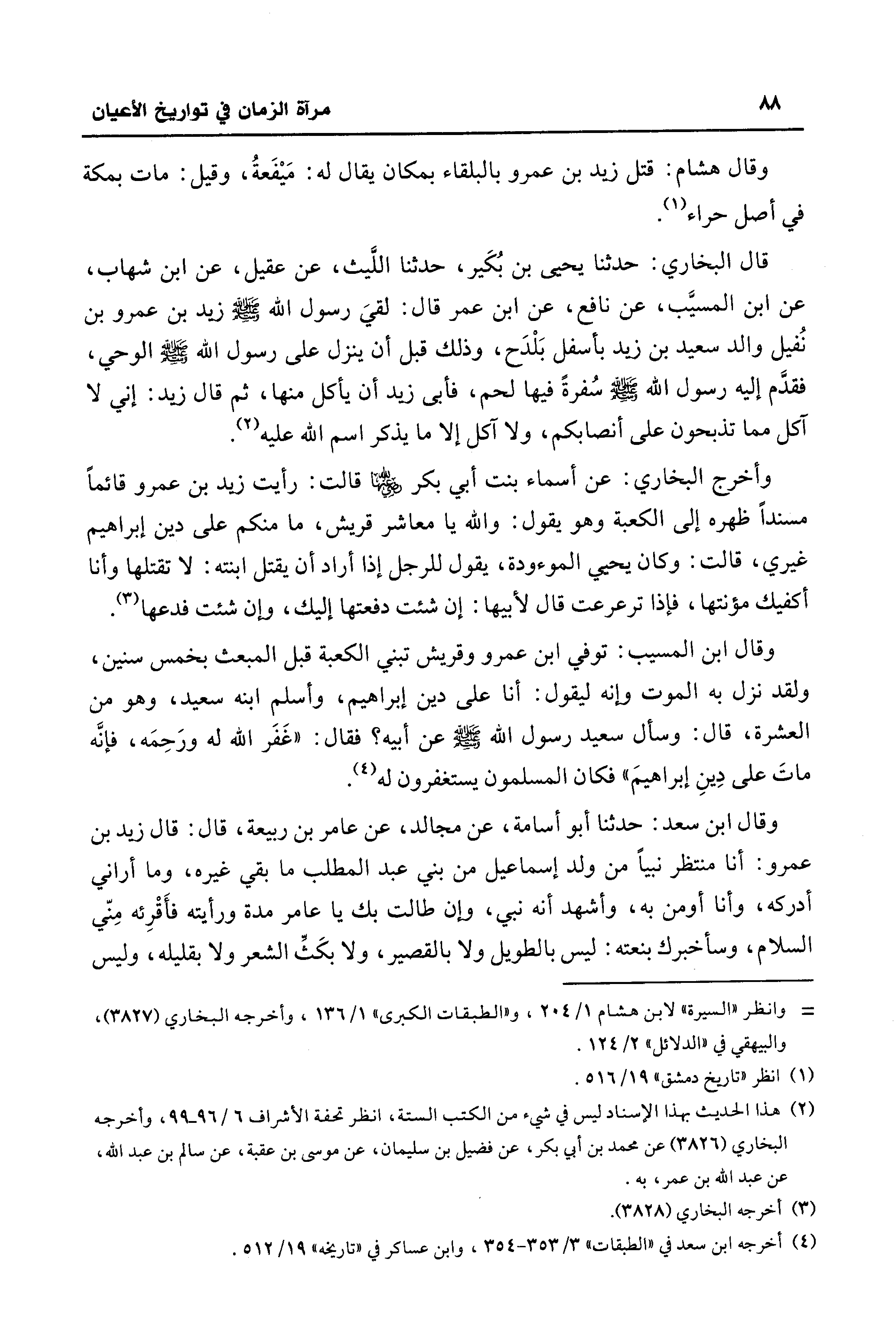 قال البخاري: حدثنا يحيى بن بُكَير، حدثنا اللَّيث، عن عقيل، عن ابن شهاب، عن ابن المسيَّب، عن نافع، عن ابن عمر قال: لقيَ رسول الله - صلى الله عليه وسلم - زيد بن عمرو بن نُفيل والد سعيد بن زيد بأسفل بَلْدَح، وذلك قبل أن ينزل على رسول الله - صلى الله عليه وسلم - الوحي، فقدَّم إليه رسول الله - صلى الله عليه وسلم - سُفرةً فيها لحم، فأبى زيد أن يأكل منها، ثم قال زيد: إني لا آكل مما تذبحون على أنصابكم، ولا آكل إلا ما يذكر اسم الله عليه (¬2).