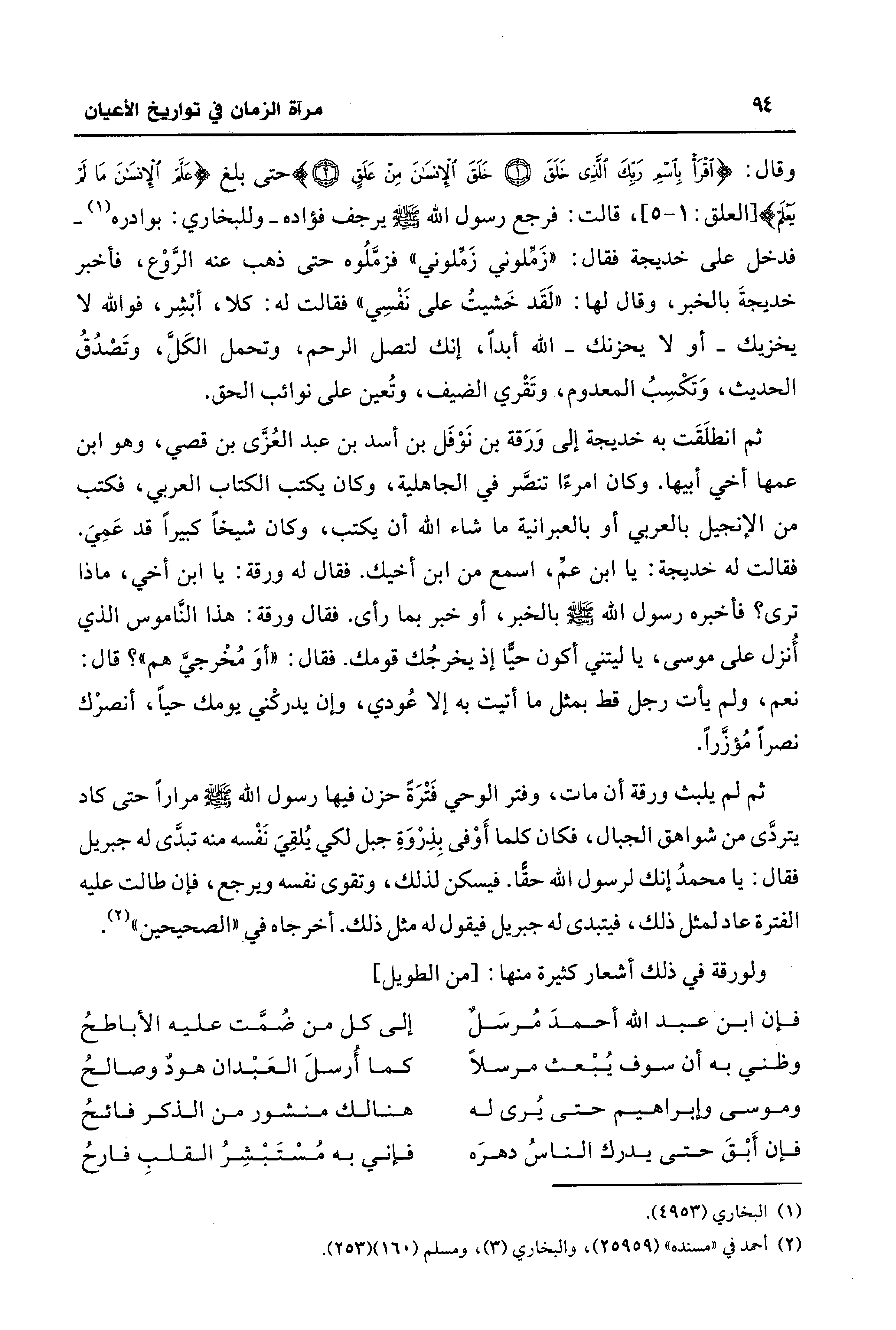 ثم انطلَقَت به خديجة إلى وَرَقة بن نَوْفَل بن أسد بن عبد العُزَّى بن قصي، وهو ابن عمها أخي أبيها. وكان امرءًا تنصَّر في الجاهلية، وكان يكتب الكتاب العربي، فكتب من الإنجيل بالعربي أو بالعبرانية ما شاء الله أن يكتب، وكان شيخًا كبيرًا قد عَمِيَ. فقالت له خديجة: يا ابن عمِّ، اسمع من ابن أخيك. فقال له ورقة: يا ابن أخي، ماذا ترى؟ فأخبره رسول الله - صلى الله عليه وسلم - بالخبر، أو خبر بما رأى. فقال ورقة: هذا الناموس الَّذي أُنزل على موسى، يا ليتني أكون حيًّا إذ يخرجُك قومك. فقال: "أوَ مُخْرجيَّ هم"؟ قال: نعم، ولم يأت رجل قط بمثل ما أتيت به إلا عُودي، وإن يدركْني يومك حيًّا، أنصرْك نصرًا مُؤزَّرًا.