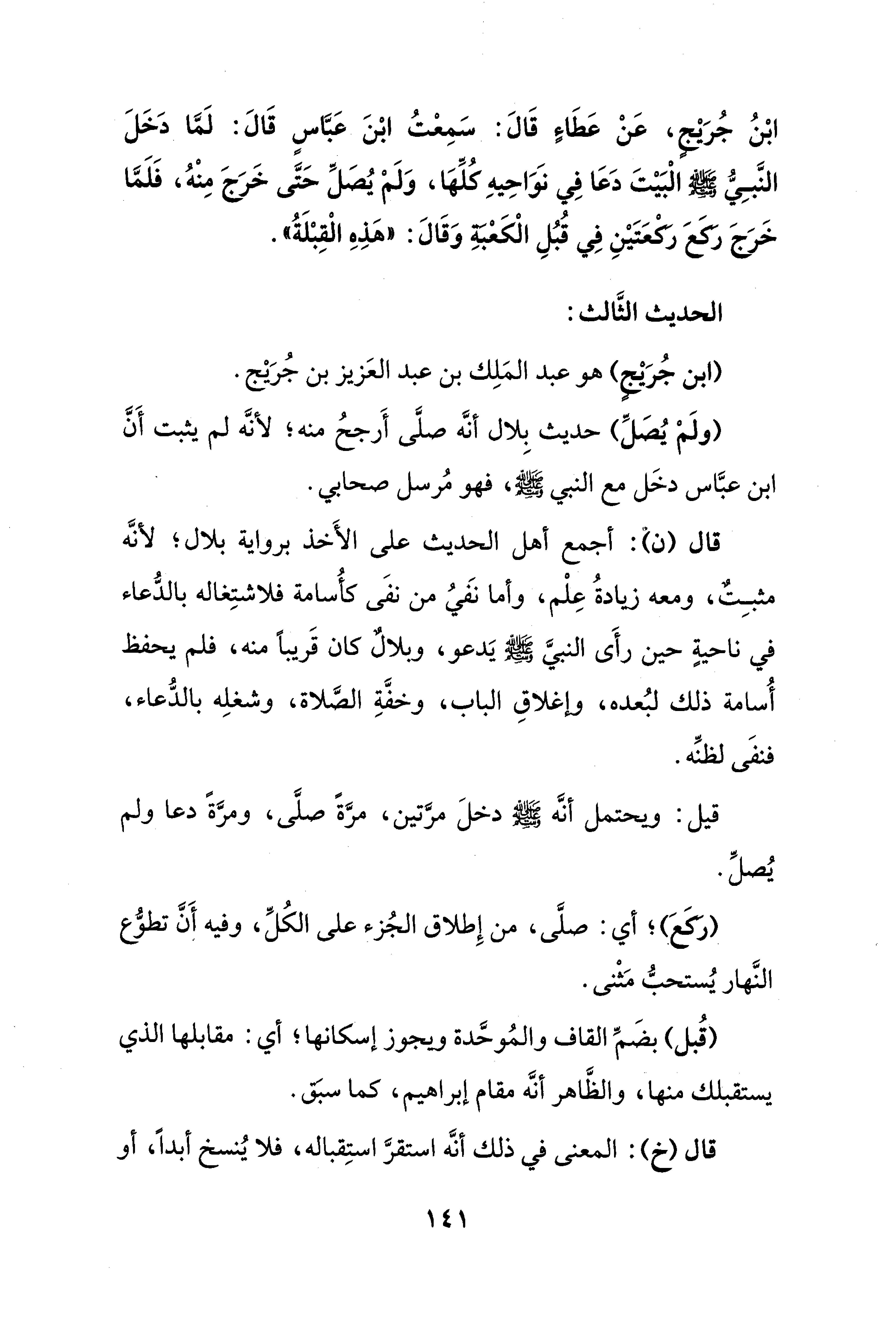 (ولَمْ يُصَلِّ) حديث بِلال أنَّه صلَّى أَرجحُ منه؛ لأنَّه لم يثبت أَنَّ ابن عبَّاس دخَل مع النبي - صلى الله عليه وسلم -، فهو مُرسل صحابي.