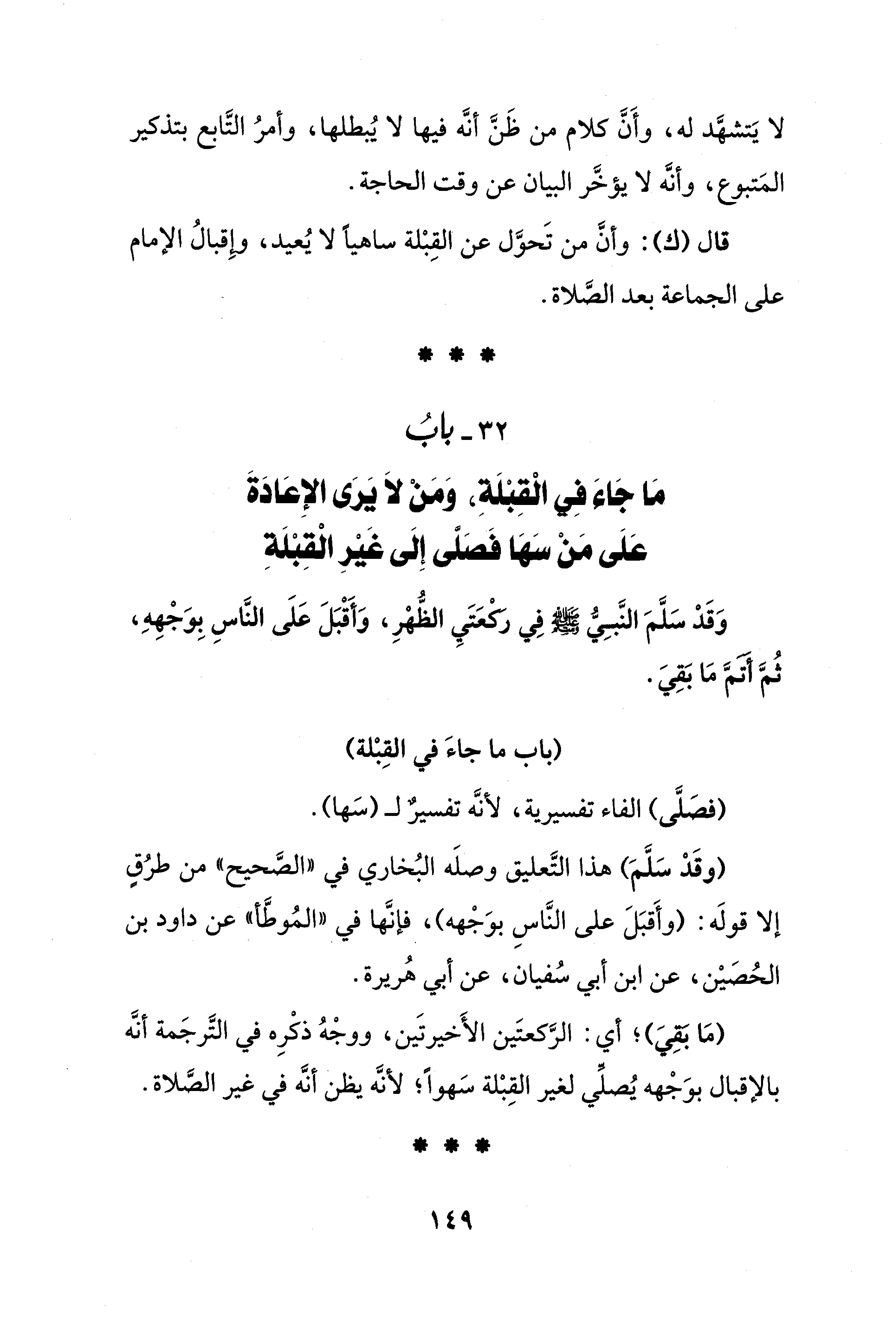 قال (ك): وأنَّ من تَحوَّل عن القِبْلة ساهيًا لا يُعيد، وإِقبالُ الإمام على الجماعة بعد الصَّلاة.