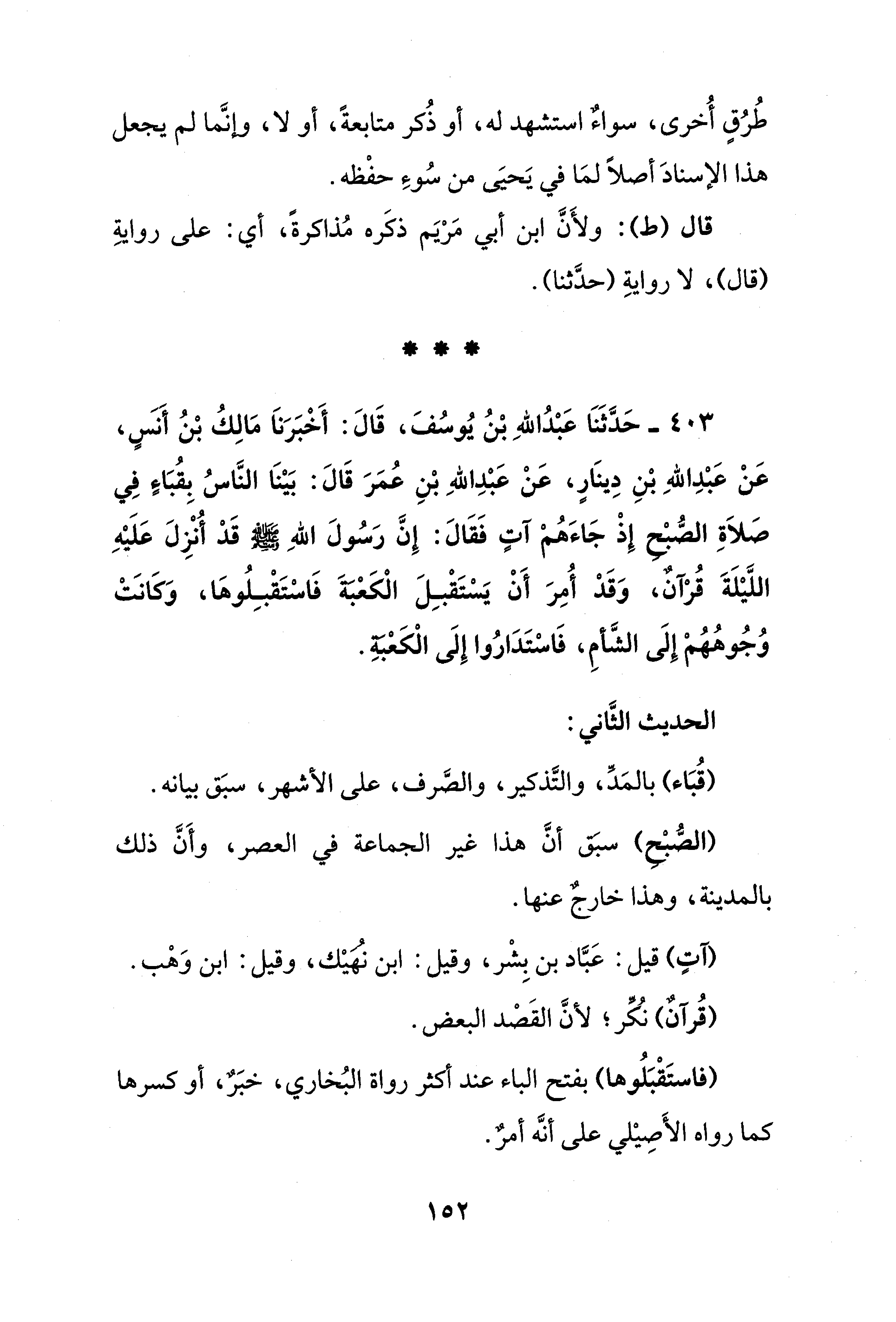 403 - حَدَّثَنَا عَبْدُ اللهِ بْنُ يُوسُفَ، قَالَ: أَخْبَرَناَ مَالِكُ بْنُ أَنسٍ، عَنْ عَبْدِ اللهِ بْنِ دِينَارٍ، عَنْ عَبْدِ اللهِ بْنِ عُمَرَ قَالَ: بَيْنَا النَّاسُ بِقُبَاءٍ في صَلاَةِ الصُّبْح إِذْ جَاءَهُمْ آتٍ فَقَالَ: إِنَّ رَسُولَ اللهِ - صلى الله عليه وسلم - قَدْ أُنْزِلَ عَلَيْهِ اللَّيْلَةَ قُرْآن، وَقَدْ أُمِرَ أَنْ يَسْتَقْبِلَ الْكَعْبةَ فَاسْتَقْبِلُوهَا، وَكَانَتْ وُجُوهُهُمْ إلَى الشَّامِ، فَاسْتَدَارُوا إِلَى الْكَعْبةِ.
