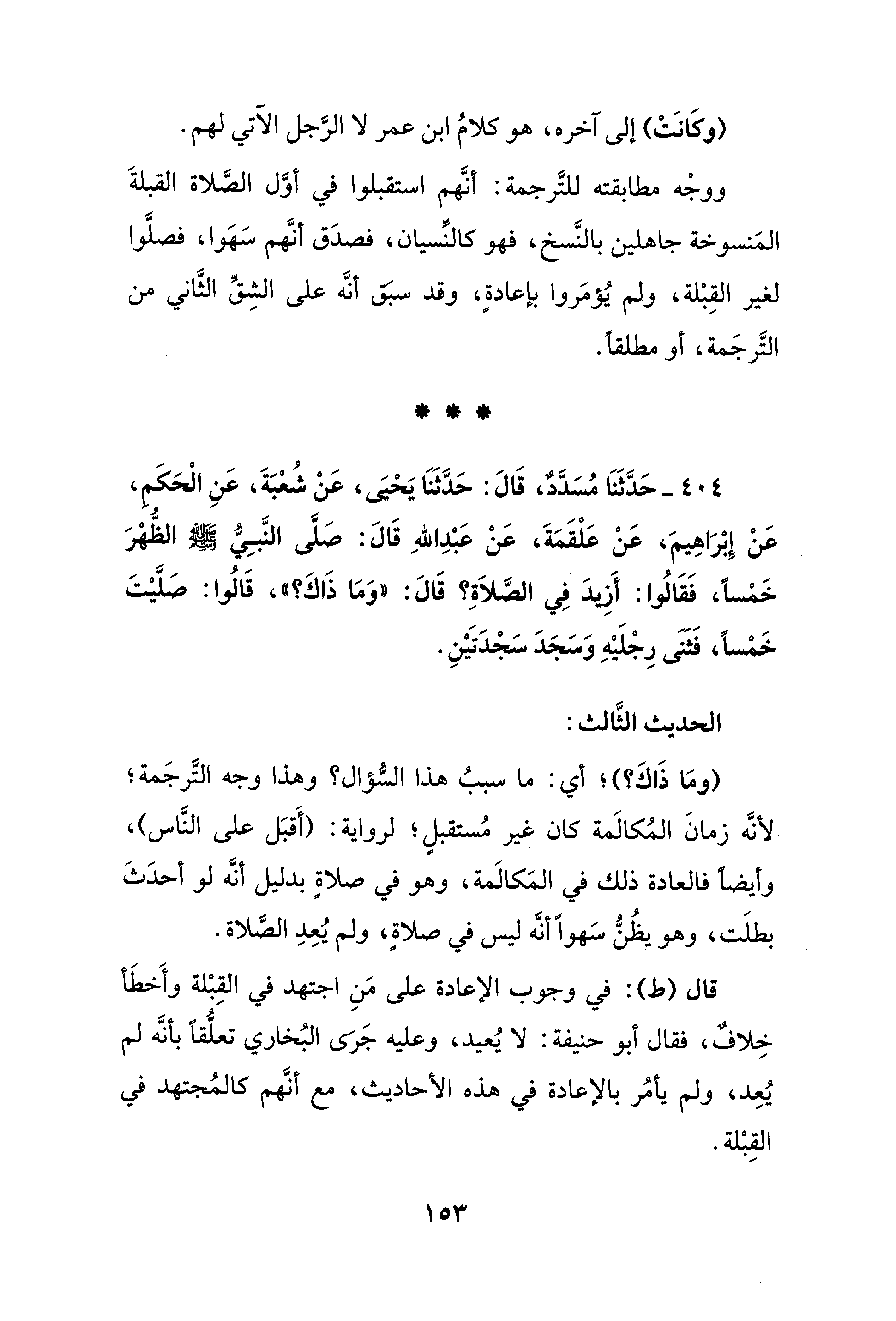 404 - حَدَّثَنَا مُسَدَّد، قَالَ: حَدَّثَنَا يَحْيَى، عَنْ شُعْبَةَ، عَنِ الْحَكَم، عَنْ إِبْرَاهِيمَ، عَنْ عَلْقَمَةَ، عَنْ عَبْدِ اللهِ قالَ: صلَّى النَّبِيُّ - صلى الله عليه وسلم - الظُّهْرَ خَمْسًا، فَقَالُوا: أَزِيدَ في الصَّلاَةِ؟ قَالَ: "وَمَا ذَاكَ؟ "، قَالُوا: صلَّيْتَ خَمْسًا، فَثنَى رِجْلَيْهِ وَسَجَدَ سَجْدَتَيْنِ.