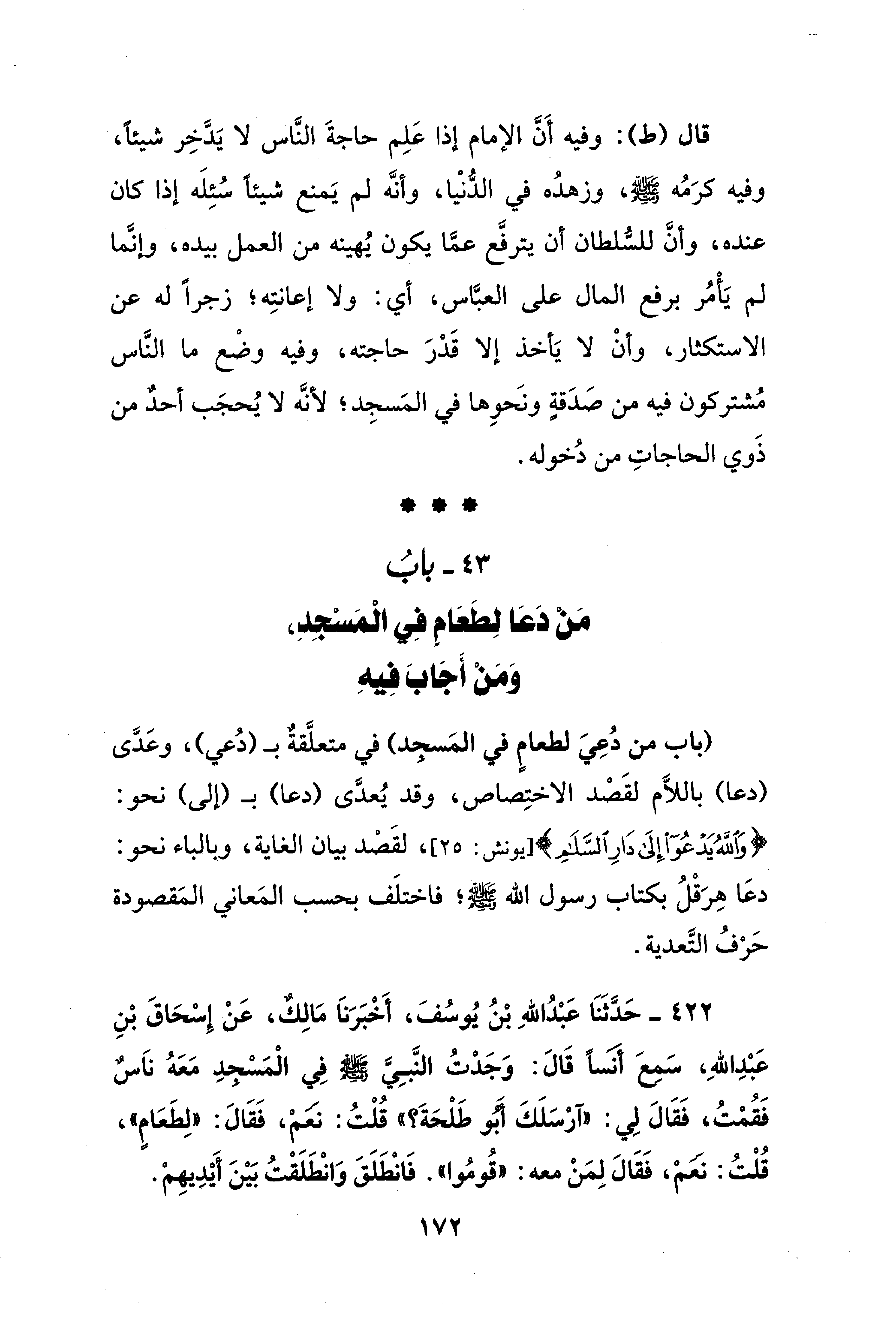 43 - بابُ مَنْ دَعَا لِطَعَامٍ في الْمَسْجِدِ، وَمَنْ أَجَابَ فِيهِ
