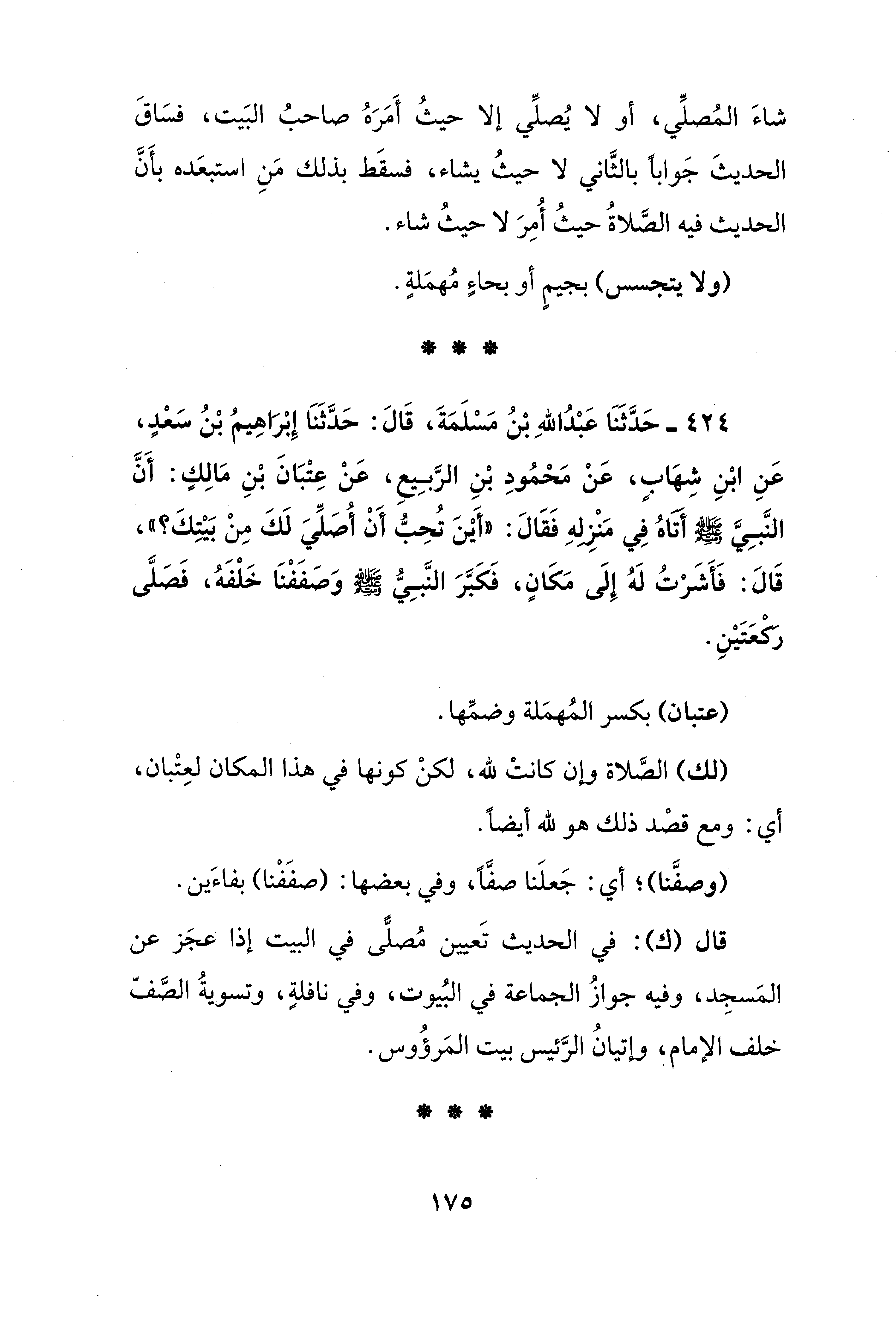 424 - حَدَّثَنَا عَبْدُ اللهِ بْنُ مَسْلَمَةَ، قَالَ: حَدَّثَنَا إِبْرَاهِيمُ بْنُ سَعْدٍ، عَنِ ابْنِ شِهَابٍ، عَنْ مَحْمُودِ بْنِ الرَّبِيعِ، عَنْ عِتْبَانَ بْنِ مَالِكٍ: أَنَّ النَّبِيَّ - صلى الله عليه وسلم - أتاهُ في مَنْزِلهِ فَقَالَ: "أَيْنَ تُحِبّ أَنْ أُصَلِّيَ لَكَ مِنْ بَيْتِكَ؟ ", قَالَ: فَأَشَرْتُ لَهُ إِلَى مَكَانٍ، فَكَبَّرَ النَّبِيّ - صلى الله عليه وسلم - وَصَفَفْنَا خَلْفَهُ، فَصَلَّى ركعَتَيْنِ.
