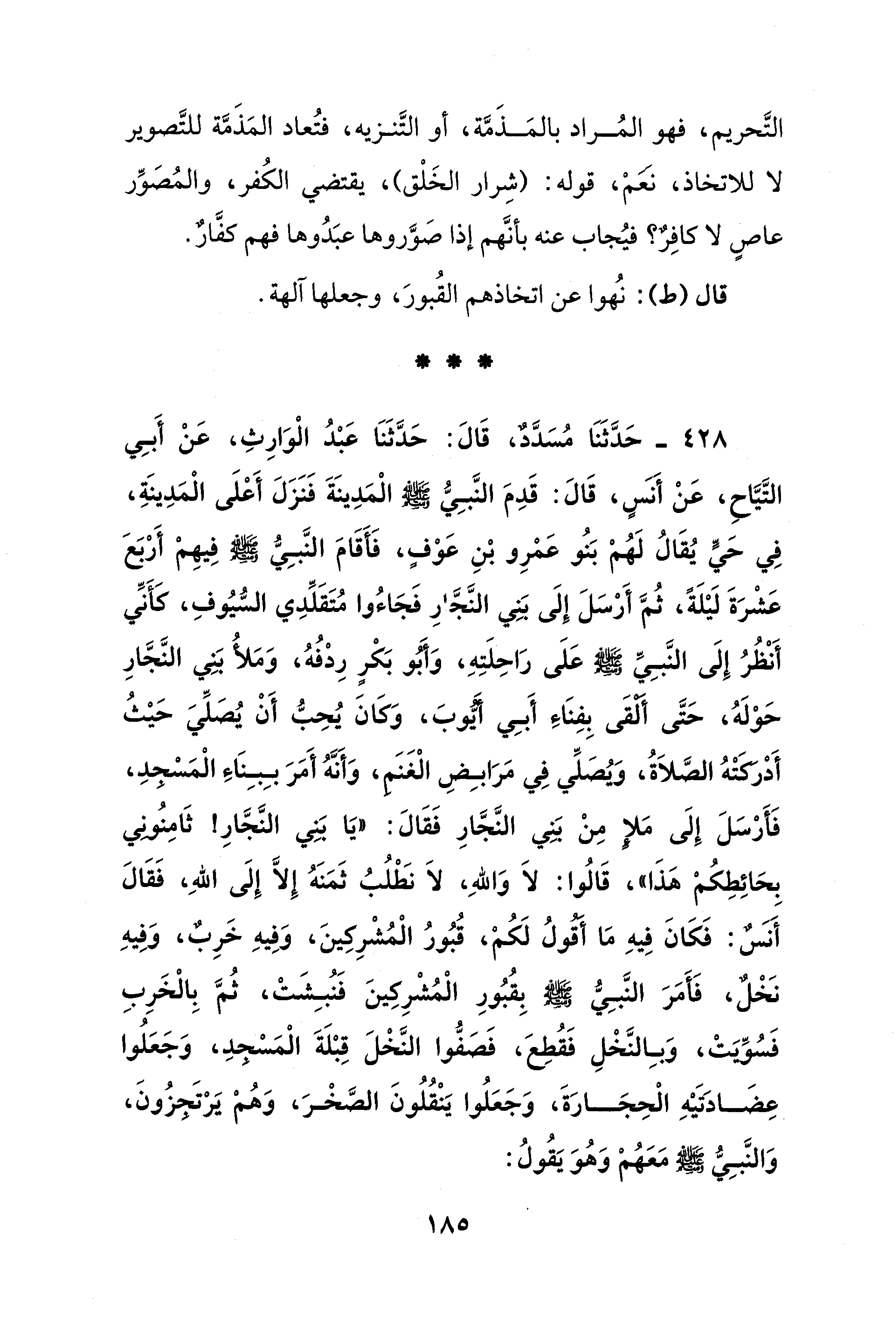 428 - حَدَّثَنَا مُسَدَّدٌ، قَالَ: حَدَّثَنَا عَبْدُ الْوَارِثِ، عَنْ أَبِي التَّيَّاحِ، عَنْ أَنسٍ، قَالَ: قَدِمَ النَّبِيُّ - صلى الله عليه وسلم - الْمَدِينَةَ فَنَزَلَ أَعْلَى الْمَدِينَةِ، في حَيٍّ يُقَالُ لَهُمْ بَنُو عَمْرِو بْنِ عَوْفٍ، فَأَقَامَ النَّبِيُّ - صلى الله عليه وسلم - فِيهِمْ أَرْبَعَ عَشْرَةَ لَيْلَةً، ثُمَّ أَرْسَلَ إِلَى بَنِي النَّجَّارِ فَجَاءُوا مُتَقَلِّدِي السُّيُوفِ، كأنِّي أَنْظُرُ إِلَى النَّبِيِّ - صلى الله عليه وسلم - عَلَى رَاحِلَتِهِ، وَأَبو بَكْرٍ رِدْفُهُ، وَمَلأُ بَنِي النَّجَّارِ حَوْلَهُ، حَتَّى ألقَى بِفِنَاءَ أَبِي أيُّوب، وَكَانَ يُحِبُّ أَنْ يُصَلِّيَ حَيْثُ أَدْركَتْهُ الصَّلاَةُ، وَيُصَلِّي في مَرَابِضِ الْغَنَم، وَأَنَّهُ أَمَرَ بِبِنَاءَ الْمَسْجدِ، فَأَرْسَلَ إِلَى مَلإٍ مِنْ بَنِي النَّجَّارِ فَقَالَ: "يَا بَنِي النَّجَّارِ! ثَامِنُوني بِحَائِطِكُمْ هَذَا"، قَالُوا: لاَ وَاللهِ، لاَ نَطْلُبُ ثَمَنَهُ إِلَّا إِلَى اللهِ، فَقَالَ أَنسٌ: فَكَانَ فِيهِ مَا أقولُ لَكُمْ، قُبُورُ الْمُشْرِكِينَ، وَفِيهِ خَرِبٌ، وَفِيهِ نَخْلٌ، فَأَمَرَ النَّبِيُّ - صلى الله عليه وسلم - بِقُبُورِ الْمُشْرِكِينَ فَنُبِشَتْ، ثُمَّ بِالْخَرِبِ فَسُوِّيتْ، وَبِالنَّخْلِ فَقُطِعَ، فَصَفُّوا النَّخْلَ قِبْلَةَ الْمَسْجدِ، وَجَعَلُوا عِضَادَتَيْهِ الْحِجَارَةَ، وَجَعَلُوا يَنْقُلُونَ الصَّخْرَ، وَهُمْ يَرْتَجزُونَ، وَالنَّبِيُّ - صلى الله عليه وسلم - مَعَهُمْ وَهُوَ يَقُولُ: