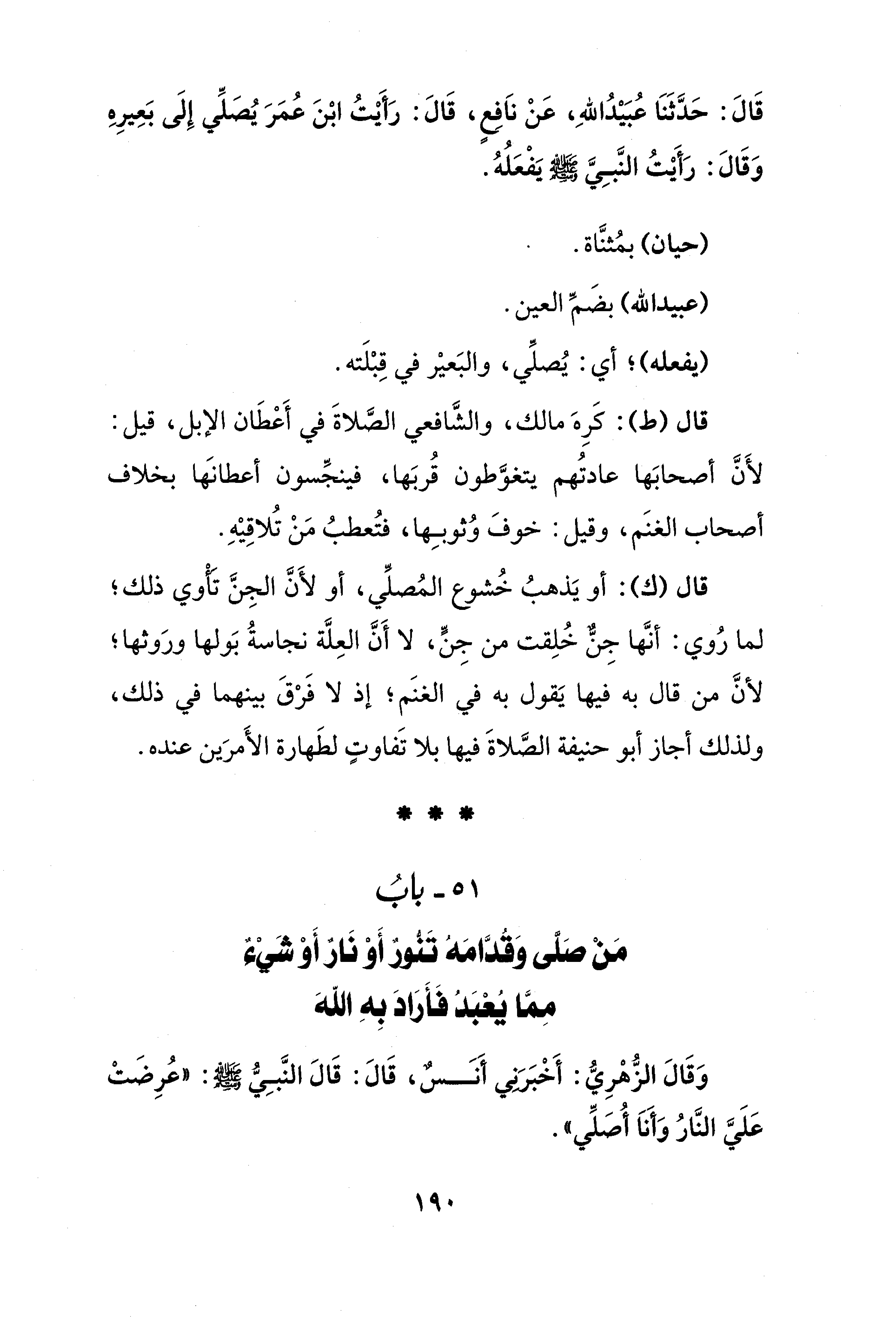 51 - بابُ مَنْ صلَّى وَقُدَّامَه تَنُّورٌ أَوْ نَارٌ أَوْ شَيْءٌ مِمَا يُعْبَدُ فأَرَادَ بِهِ الله