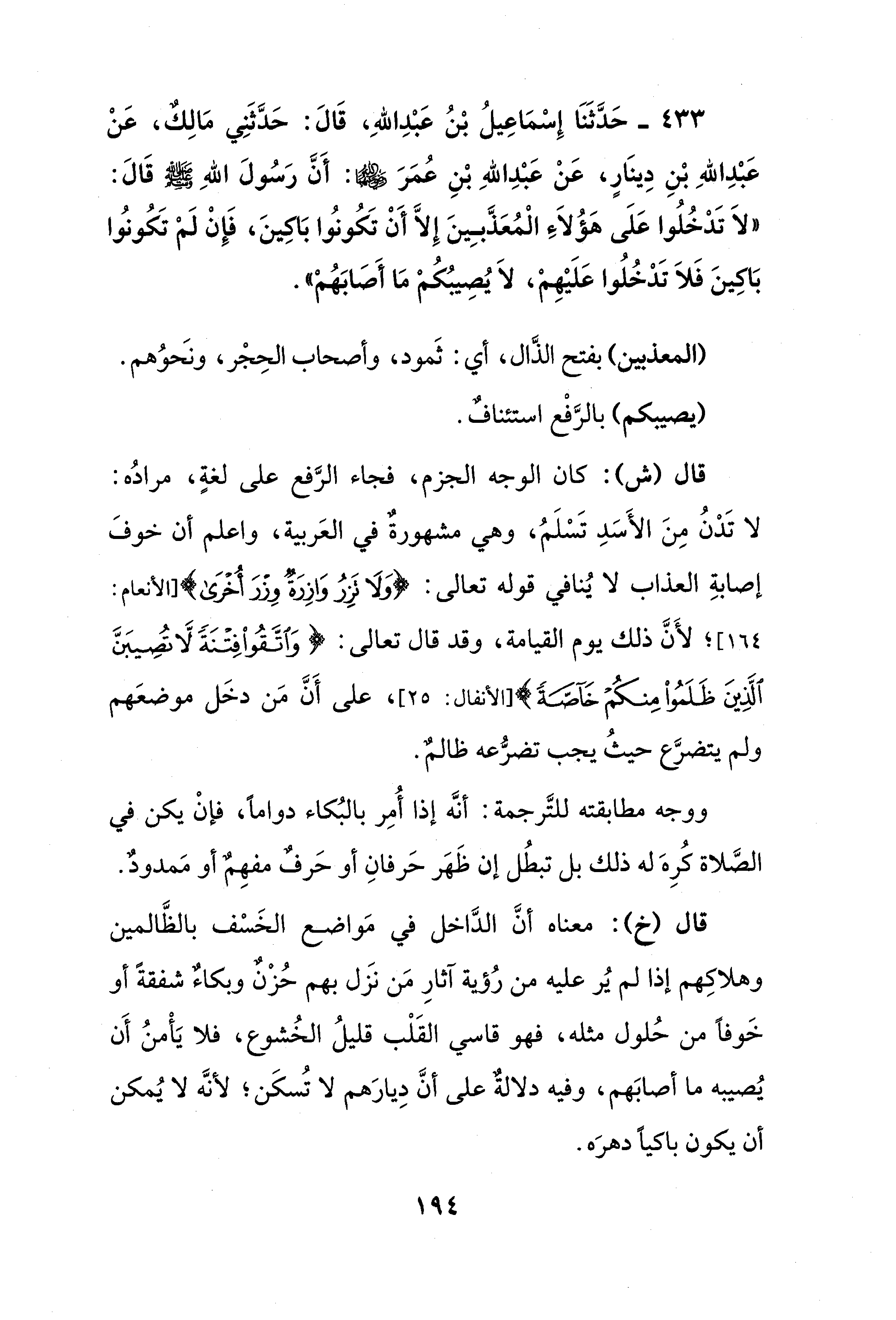 433 - حَدَّثَنَا إِسْمَاعِيلُ بْنُ عَبْدِ اللهِ، قَالَ: حَدَّثَنِي مَالِكٌ، عَنْ عَبْدِ اللهِ بْنِ دِينَارٍ، عَنْ عَبْدِ اللهِ بْنِ عُمَرَ: أَنَّ رَسُولَ اللهِ - صلى الله عليه وسلم - قَالَ: "لاَ تَدْخُلُوا عَلَى هَؤُلاَءِ الْمُعَذَّبِينَ إِلَّا أَنْ تَكُونُوا بَاكِينَ، فَإِنْ لَمْ تَكُونُوا بَاكِينَ فَلاَ تَدْخُلُوا عَلَيهِم، لاَ يُصِيبُكُم مَا أَصَابَهُم".