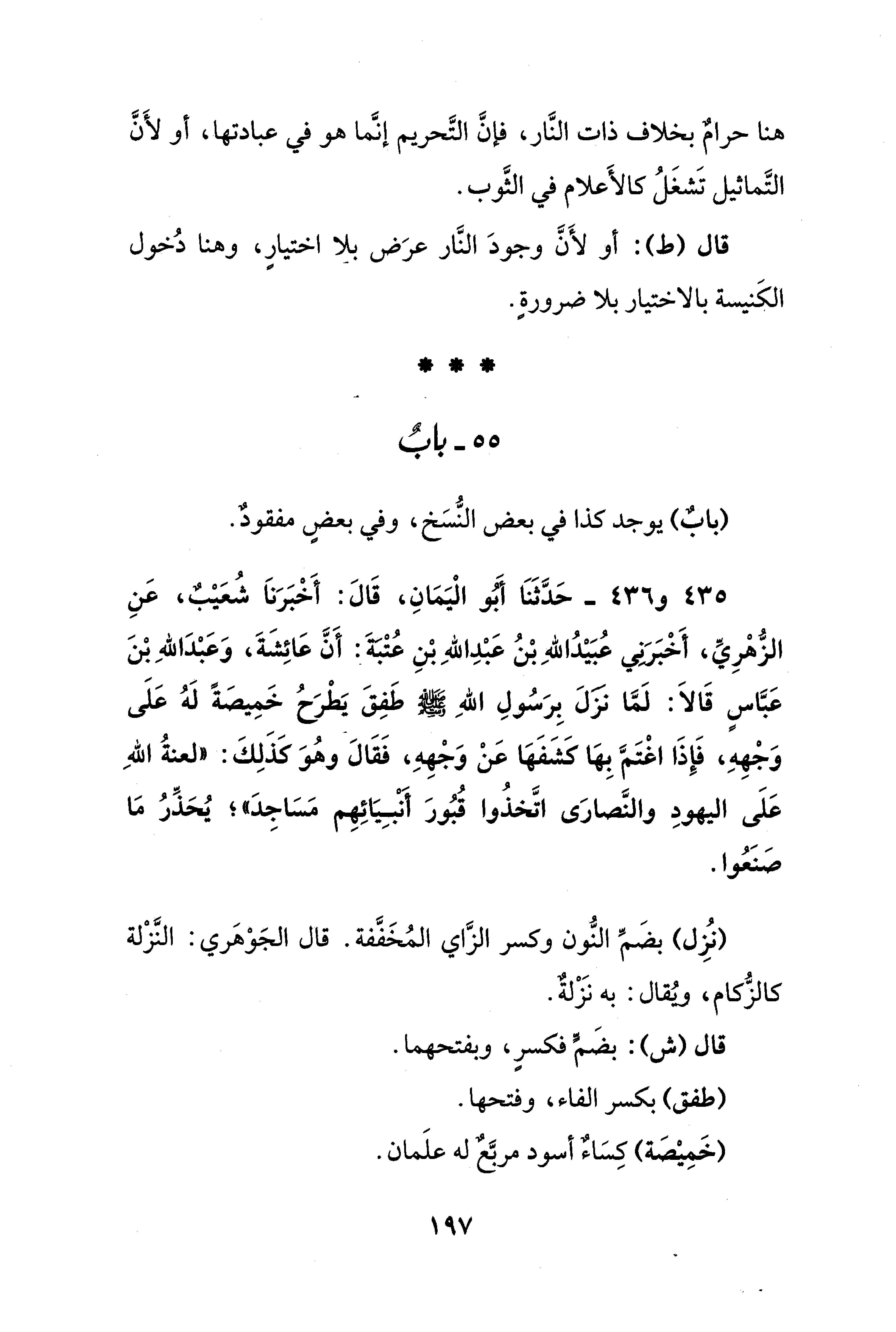 435 - و 436 - حَدَّثَنَا أبو الْيَمَانِ، قَالَ: أَخْبَرَناَ شُعَيْبٌ، عَنِ الزُّهْرِيِّ، أَخْبَرَني عُبَيْدُ اللهِ بْنُ عَبْدِ اللهِ بْنِ عُتْبَةَ أَنَّ عَائِشَةَ، وَعَبْدَ اللهِ بْنَ عَبَّاسٍ قَالاَ: لَمَّا نزَلَ بِرَسُولِ اللهِ - صلى الله عليه وسلم - طَفِقَ يَطْرَحُ خَمِيصَةً لَهُ عَلَى وَجْهِهِ، فَإِذَا اغْتَمَّ بِهَا كَشَفَهَا عَنْ وَجْهِهِ، فَقَالَ وهُوَ كَذَلِكَ: "لعنةُ اللهِ عَلَى اليهودِ والنَّصارَى اتَّخذُوا قُبُورَ أَنْبِيَائِهِم مَسَاجِدَ"؛ يُحَذِّرُ مَا صنَعُوا.