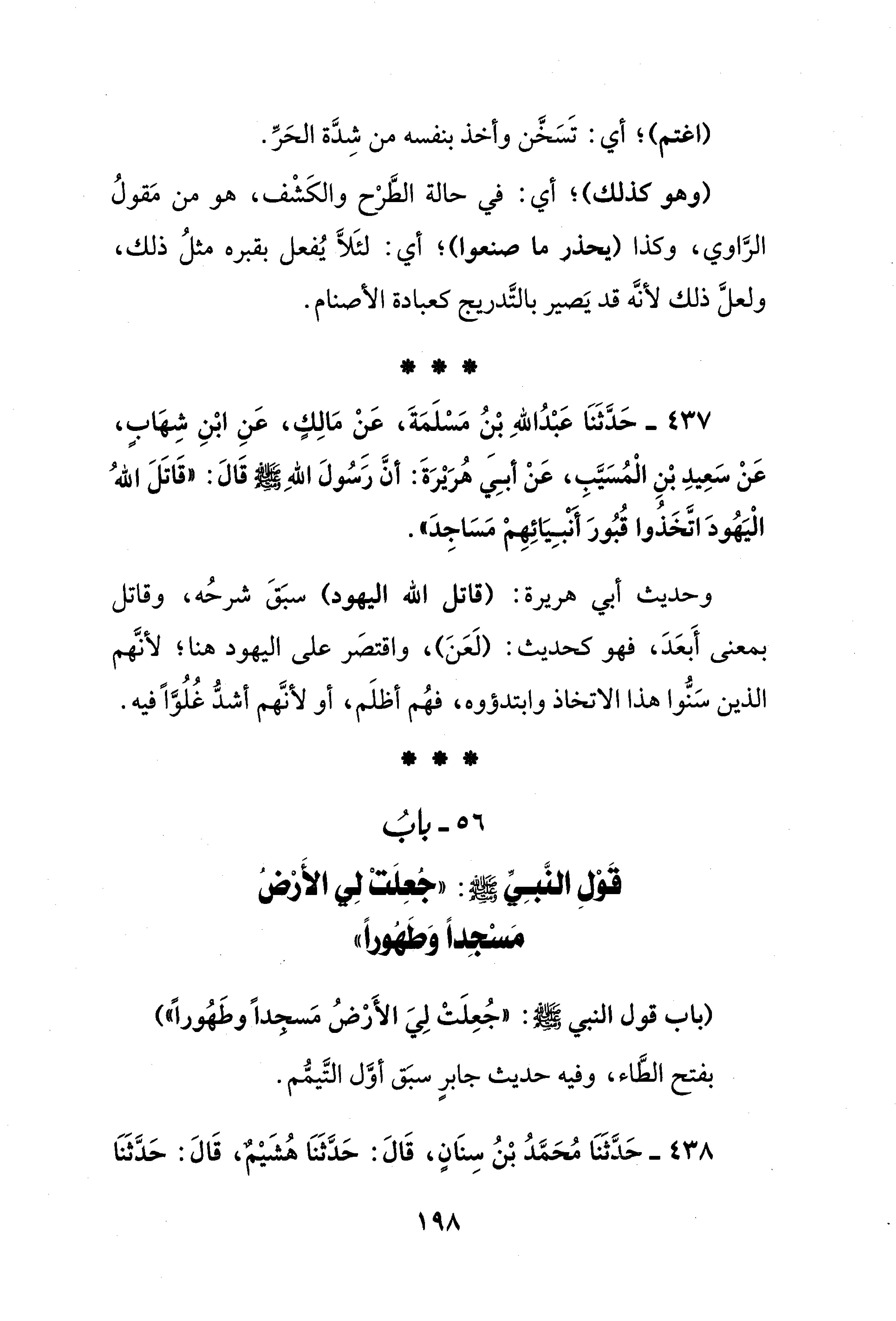 437 - حَدَّثَنَا عَبْدُ اللهِ بْنُ مَسْلَمَةَ، عَنْ مَالِكٍ، عَنِ ابْنِ شِهَابٍ، عَنْ سَعِيدِ بْنِ الْمُسَيَّبِ، عَنْ أبِيَ هُرَيْرَةَ: أنَّ رسُولَ اللهِ - صلى الله عليه وسلم - قَالَ: "قَاتَلَ اللهُ الْيَهُودَ اتَّخَذُوا قُبُورَ أنبِيَائِهِمْ مَسَاجِدَ".