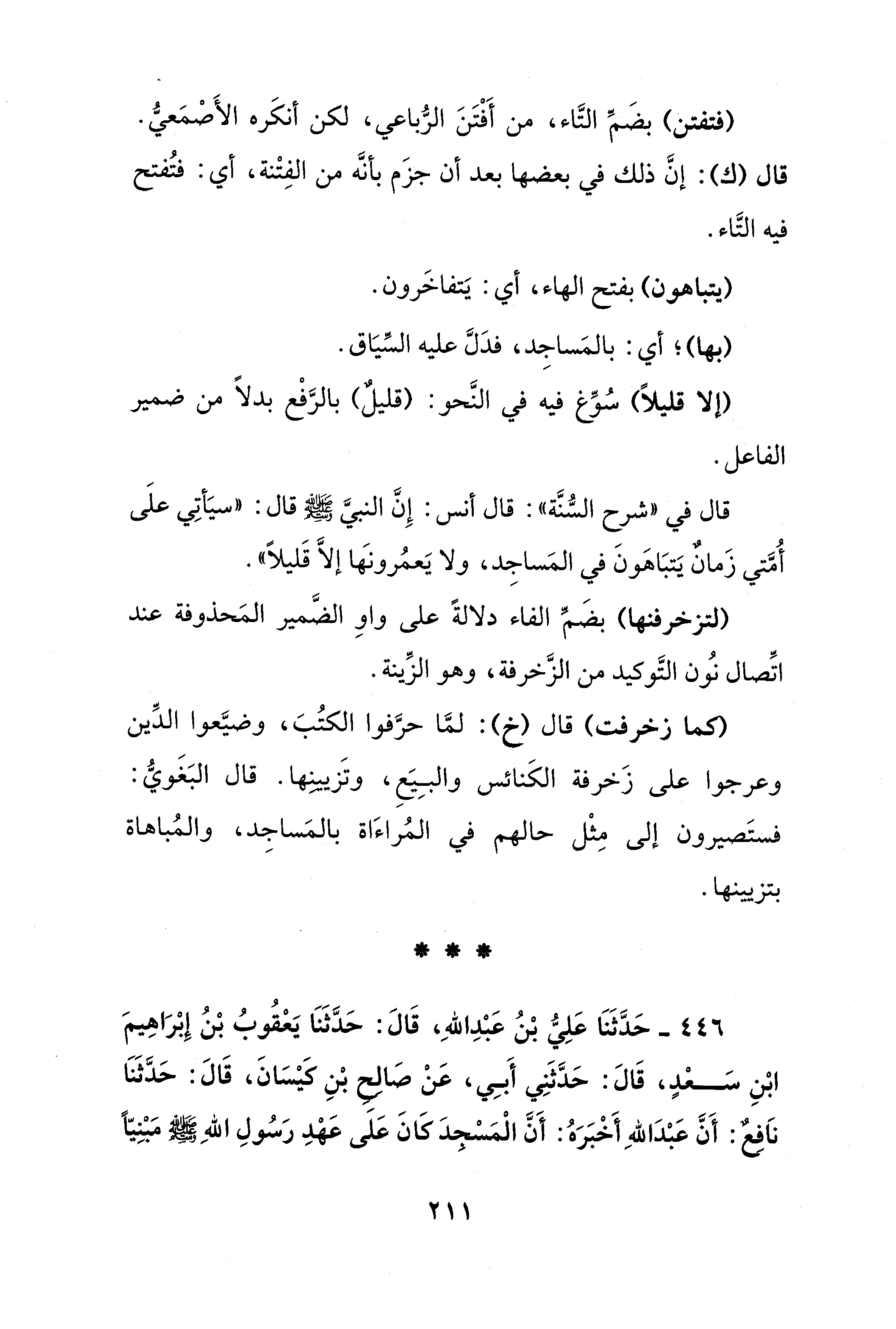 قال في "شرح السُّنَّة": قال أنس: إِنَّ النبيَّ - صلى الله عليه وسلم - قال: "سيَأتِي علَى أُمَّتي زَمانٌ يتبَاهَونَ في المَساجِد، ولا يَعمُرونَها إلَّا قَليلًا".