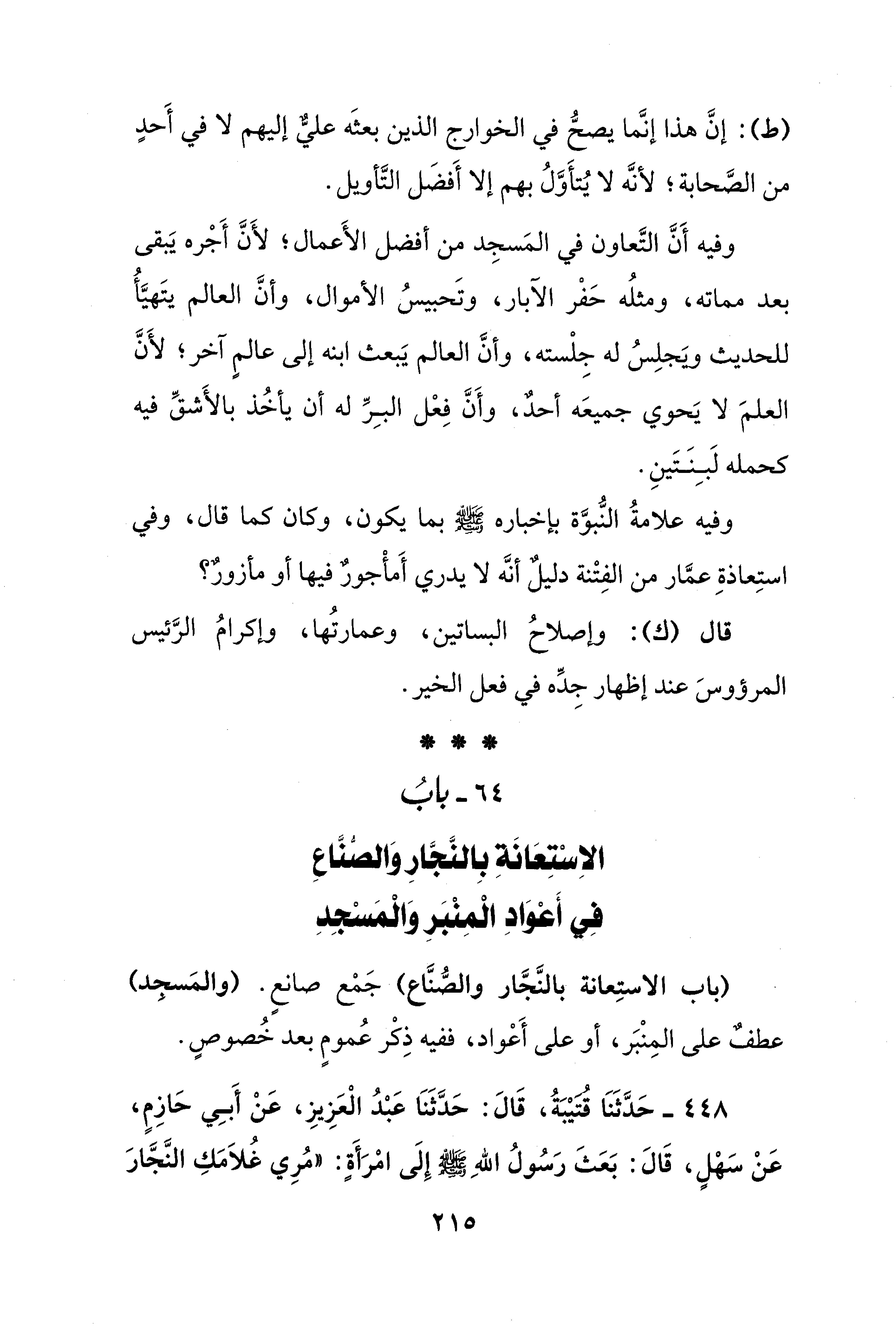 64 - بابُ الاِسْتِعَانَةِ بِالنَّجَّارِ وَالصُّنَّاعِ في أَعْوَادِ الْمِنْبَرِ وَالْمَسْجِدِ