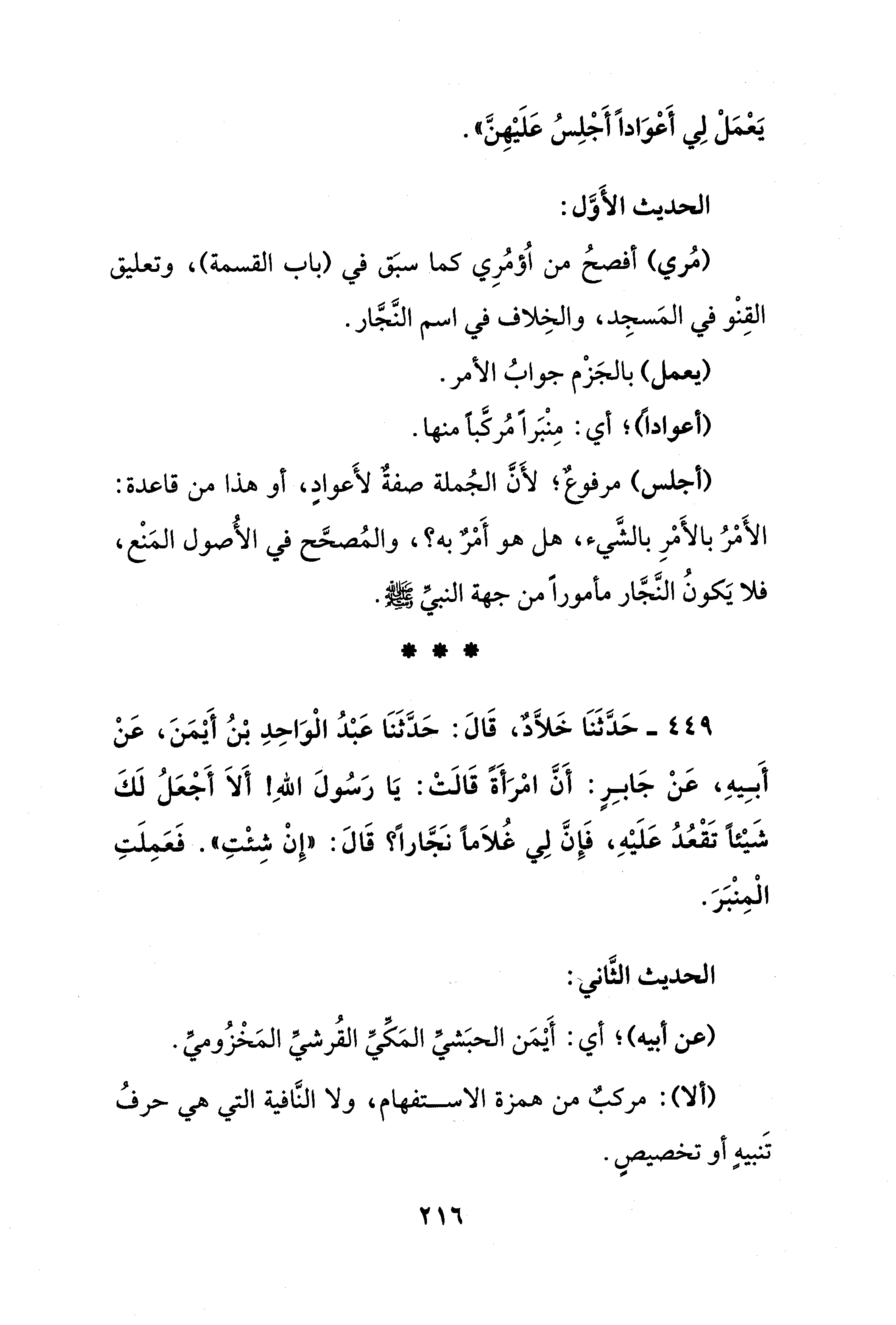 449 - حَدَّثَنَا خَلَّادٌ، قَالَ: حَدَّثَنَا عَبدُ الْوَاحِدِ بنُ أَيمَنَ، عَنْ أَبِيهِ، عَنْ جَابِرٍ: أَنَّ امْرَأَةً قَالَتْ: يَا رَسُولَ اللهِ! أَلاَ أَجْعَلُ لَكَ شَيْئًا تَقْعُدُ عَلَيْهِ، فَإِنَّ لِي غُلاَمًا نَجَّارًا؟ قَالَ: "إِنْ شِئْتِ". فَعَمِلَتِ الْمِنْبَرَ.