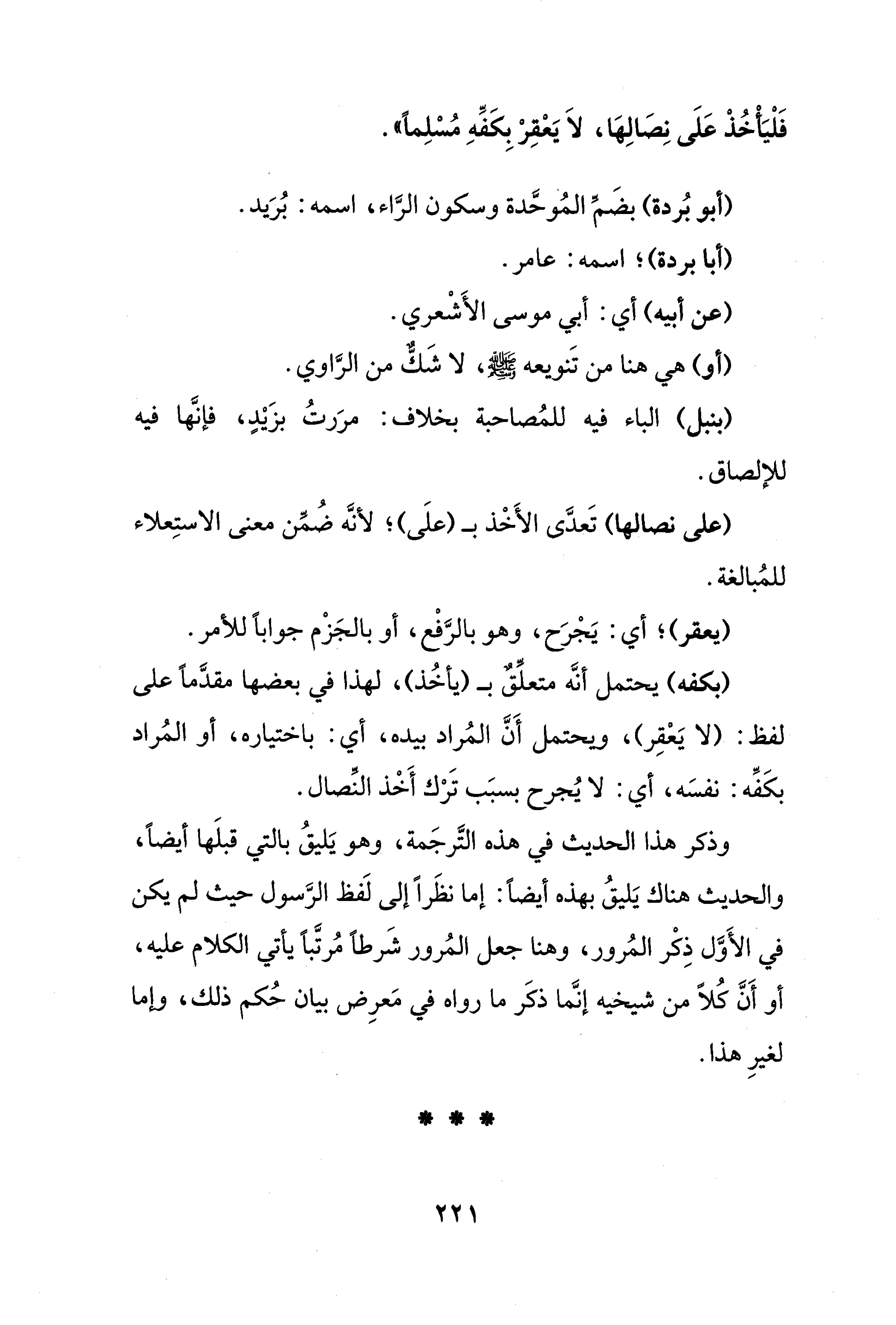 (بكفه) يحتمل أنَّه متعلِّقٌ بـ (يأخُذ)، لهذا في بعضها مقدَّمًا على لفظ: (لا يَعْقِر)، ويحتمل أَنَّ المُراد بيده، أي: باختياره، أو المُراد بكَفِّه: نفسَه، أي: لا يُجرح بسبَب تَرْك أَخْذ النِّصال.