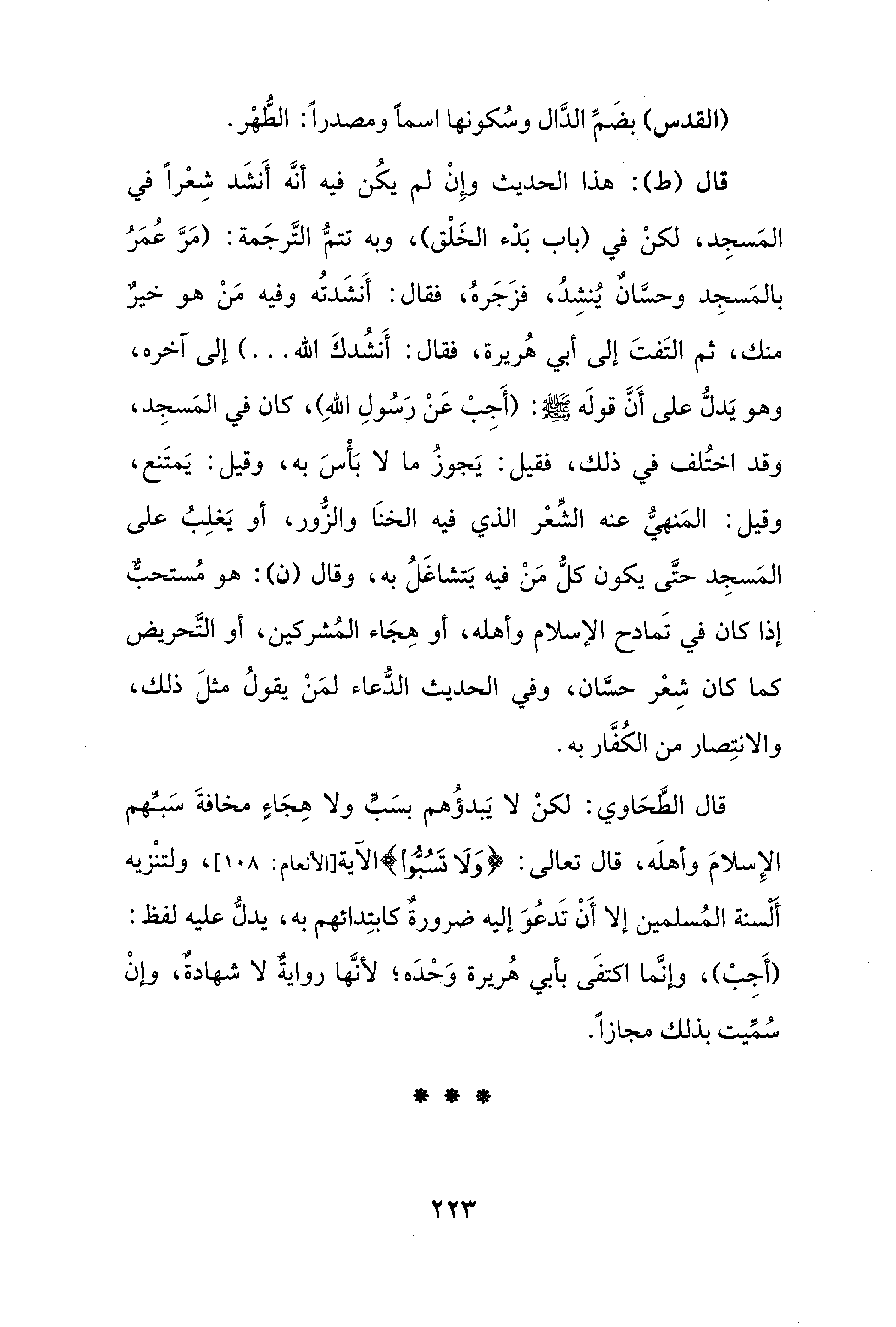 قال (ط): هذا الحديث وإِنْ لم يكُن فيه أنَّه أَنشَد شِعْرًا في المَسجِد، لكنْ في (باب بَدْء الخَلْق)، وبه تتمُّ التَّرجَمة: (مَرَّ عُمَرُ بالمَسجِد وحسَّانٌ يُنشِدُ، فزَجَرهُ، فقال: أَنشَدتُه وفيه مَنْ هو خيرٌ منك، ثم التَفتَ إلى أبي هُريرة، فقال: أَنشُدكَ الله ...) إلى آخره، وهو يَدلُّ على أَنَّ قولَه - صلى الله عليه وسلم -: (أَجِبْ عَنْ رَسُولِ اللهِ)، كان في المَسجِد، وقد اختُلف في ذلك، فقيل: يَجوزُ ما لا بَأْسَ به، وقيل: يَمتَنع، وقيل: المَنهيُّ عنه الشِّعْر الذي فيه الخنَا والزُّور، أو يَغلِبُ على المَسجِد حتَّى يكون كلُّ مَنْ فيه يَتشاغَلُ به، وقال (ن): هو مُستحبٌّ إذا كان في تَمادح الإِسلام وأهله، أو هِجَاء المُشركين، أو التَّحريض كما كان شِعْر حسَّان، وفي الحديث الدُّعاء لمَنْ يقولُ مثلَ ذلك، والانتِصار من الكُفَّار به.
