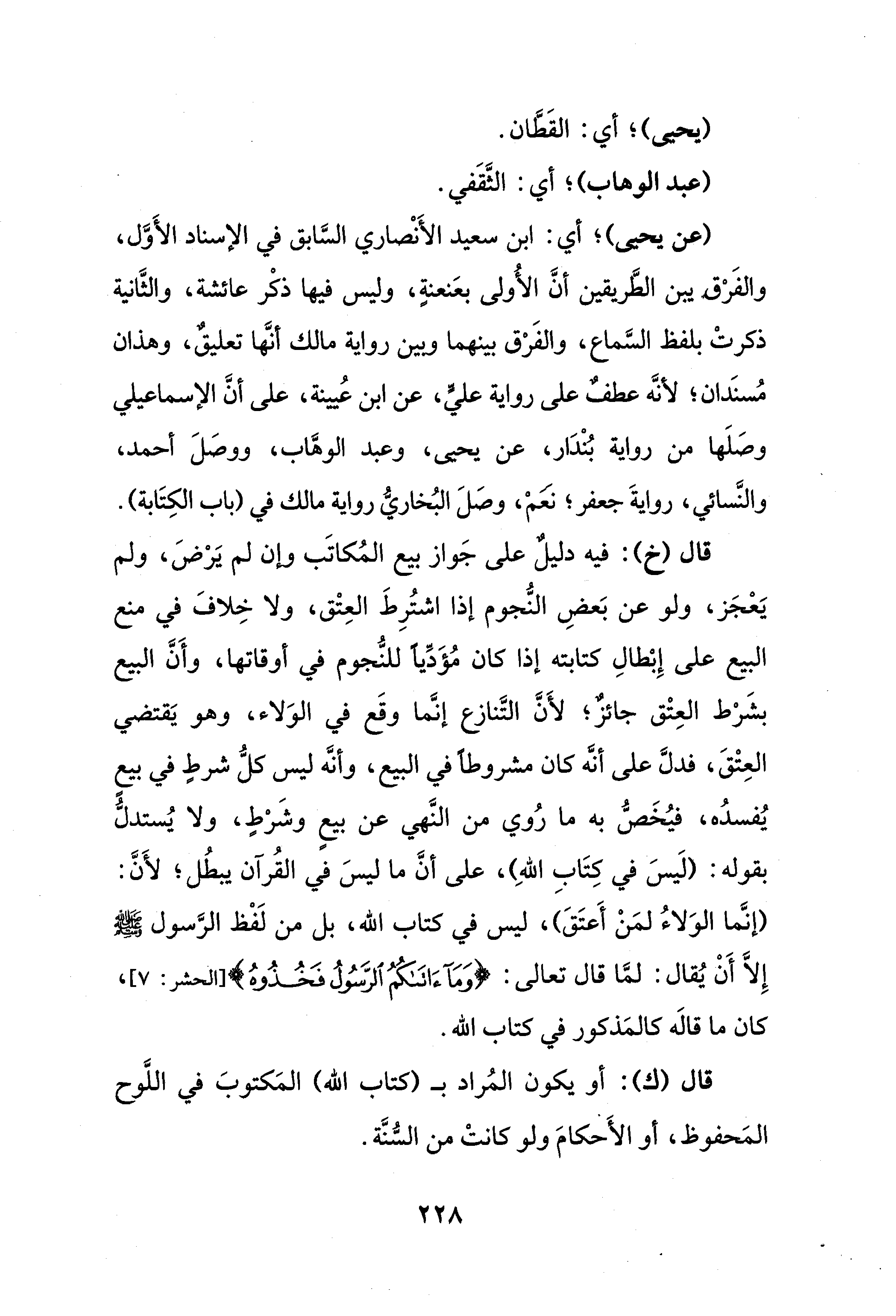 قال (خ): فيه دليلٌ على جَواز بيع المُكاتَب وإن لم يَرْضَ، ولم يَعْجَز، ولو عن بَعض النُّجوم إذا اشتُرِطَ العِتْق، ولا خِلافَ في منع البيع على إِبْطالِ كتابته إذا كان مُؤَدِّيًا للنُّجوم في أوقاتها، وأَنَّ البيع بشَرْط العِتْق جائزٌ؛ لأَنَّ التَّنازع إنَّما وقَع في الوَلاء، وهو يَقتضي العِتْقَ، فدلَّ على أنَّه كان مشروطًا في البيع، وأنَّه ليس كلُّ شرطٍ في بيع يُفسدُه، فيُخَصُّ به ما رُوي من النَّهي عن بيعٍ وشَرْطٍ، ولا يُستدلُّ بقوله: (لَيسَ في كِتَابِ الله)، على أنَّ ما ليسَ في القُرآن يبطُل؛ لأَنَّ: (إنَّما الوَلاءُ لمَنْ أَعتَقَ)، ليس في كتاب الله، بل من لَفْظ الرَّسول - صلى الله عليه وسلم - إلا أَنْ يُقال: لمَّا قال تعالى: وَ {وَمَا آتَاكُمُ الرَّسُولُ فَخُذُوهُ} [الحشر: 7] , كان ما قالَه كالمَذكور في كتاب الله.