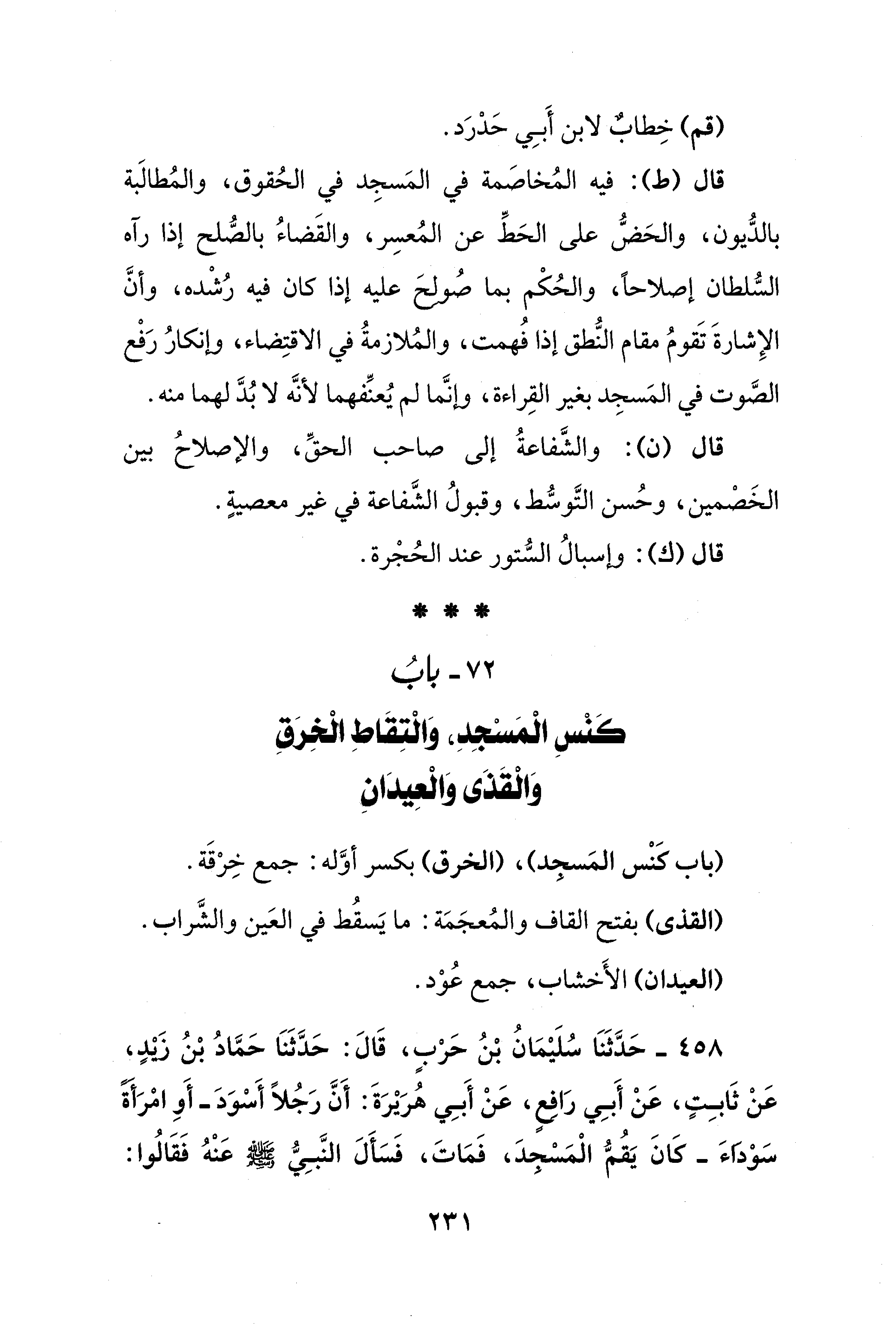 72 - بابُ كَنْسِ الْمَسْجِدِ، وَالْتِقَاطِ الْخِرَقِ وَالْقَذَى وَالْعِيدَانِ