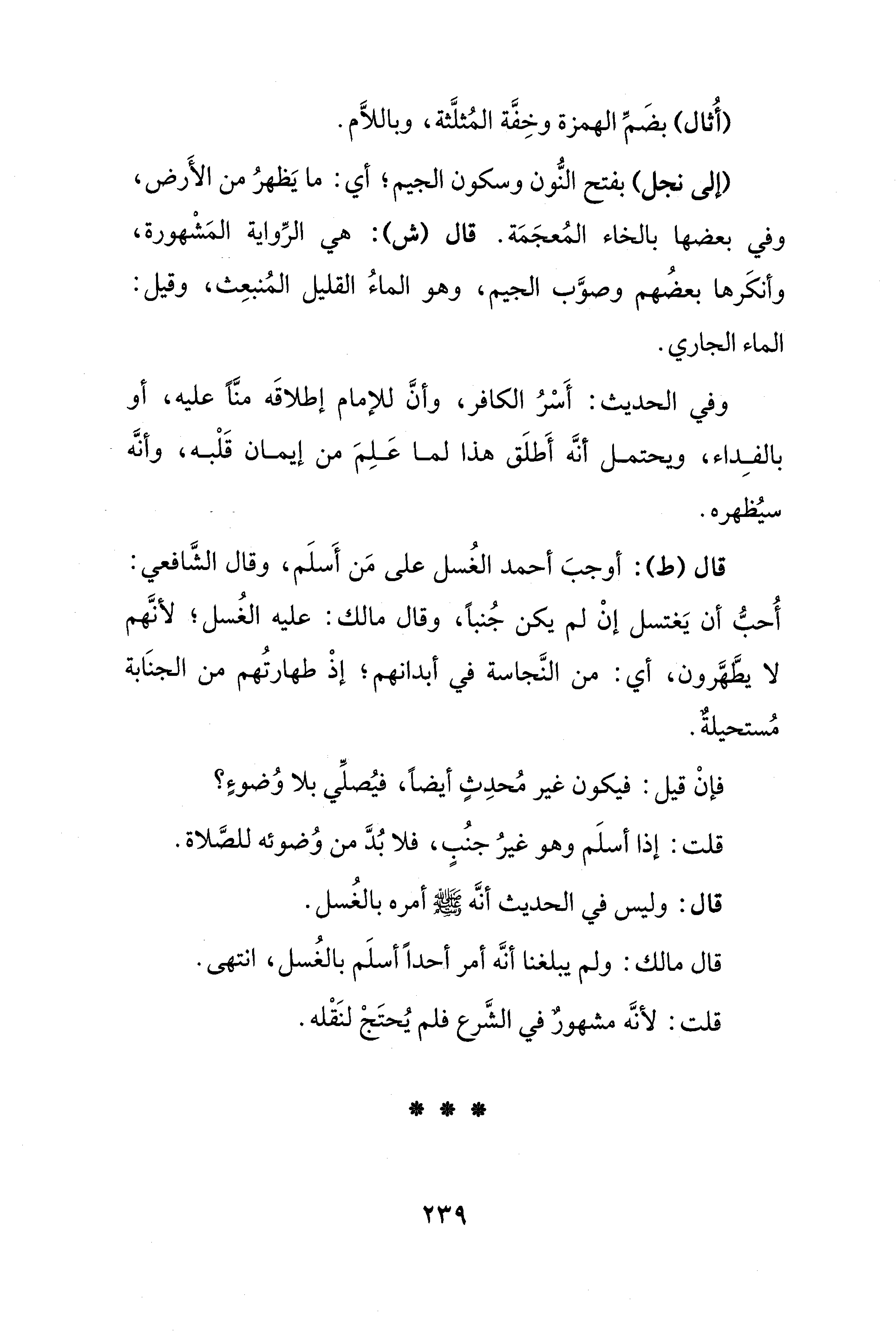 قال مالك: ولم يبلغنا أنَّه أمر أحدًا أسلَم بالغُسل، انتهى.