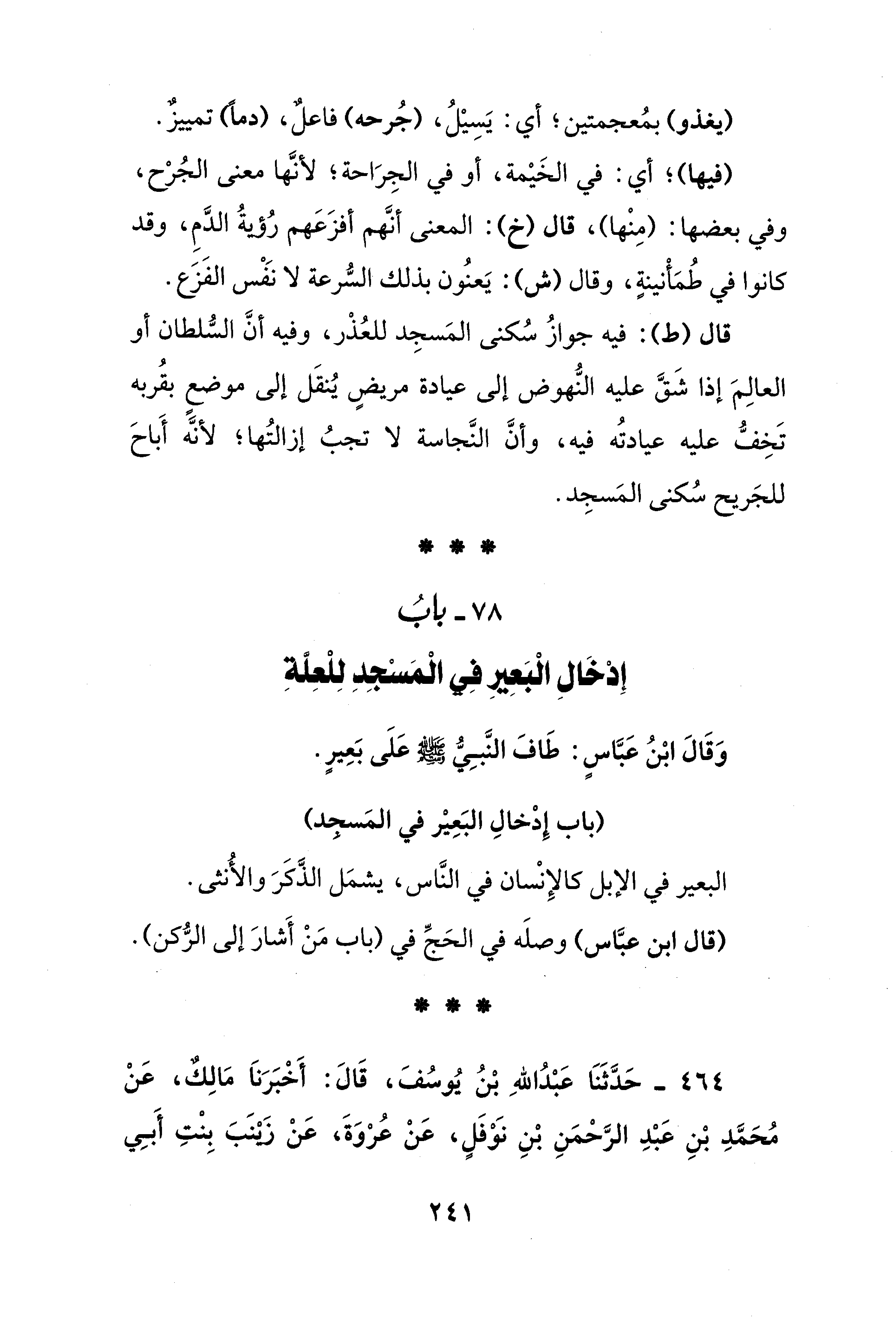 78 - بابُ إِدْخَالِ الْبَعِيرِ في الْمَسْجِدِ لِلْعِلةِ