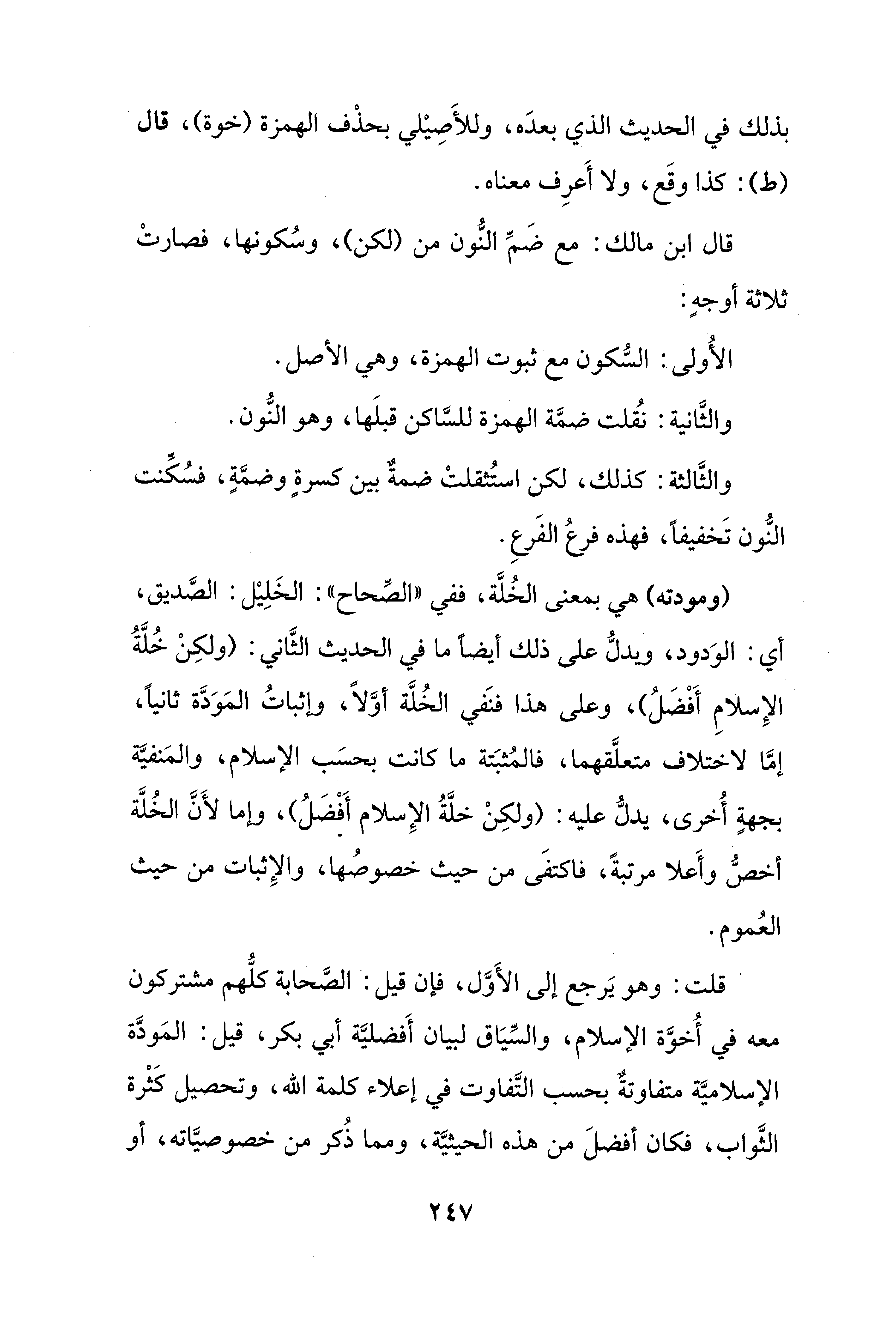 قلت: وهو يَرجع إلى الأَوَّل، فإن قيل: الصَّحابة كلُّهم مشتركون معه في أُخوَّة الإِسلام، والسِّيَاق لبيان أَفضلية أبي بكر، قيل: المَودَّة الإِسلاميَّة متفاوتةٌ بحسب التَّفاوت في إعلاء كلمة الله، وتحصيل كَثْرة الثَّواب، فكان أفضلَ من هذه الحيثيَّة، ومما ذُكر من خصوصيَّاته، أو