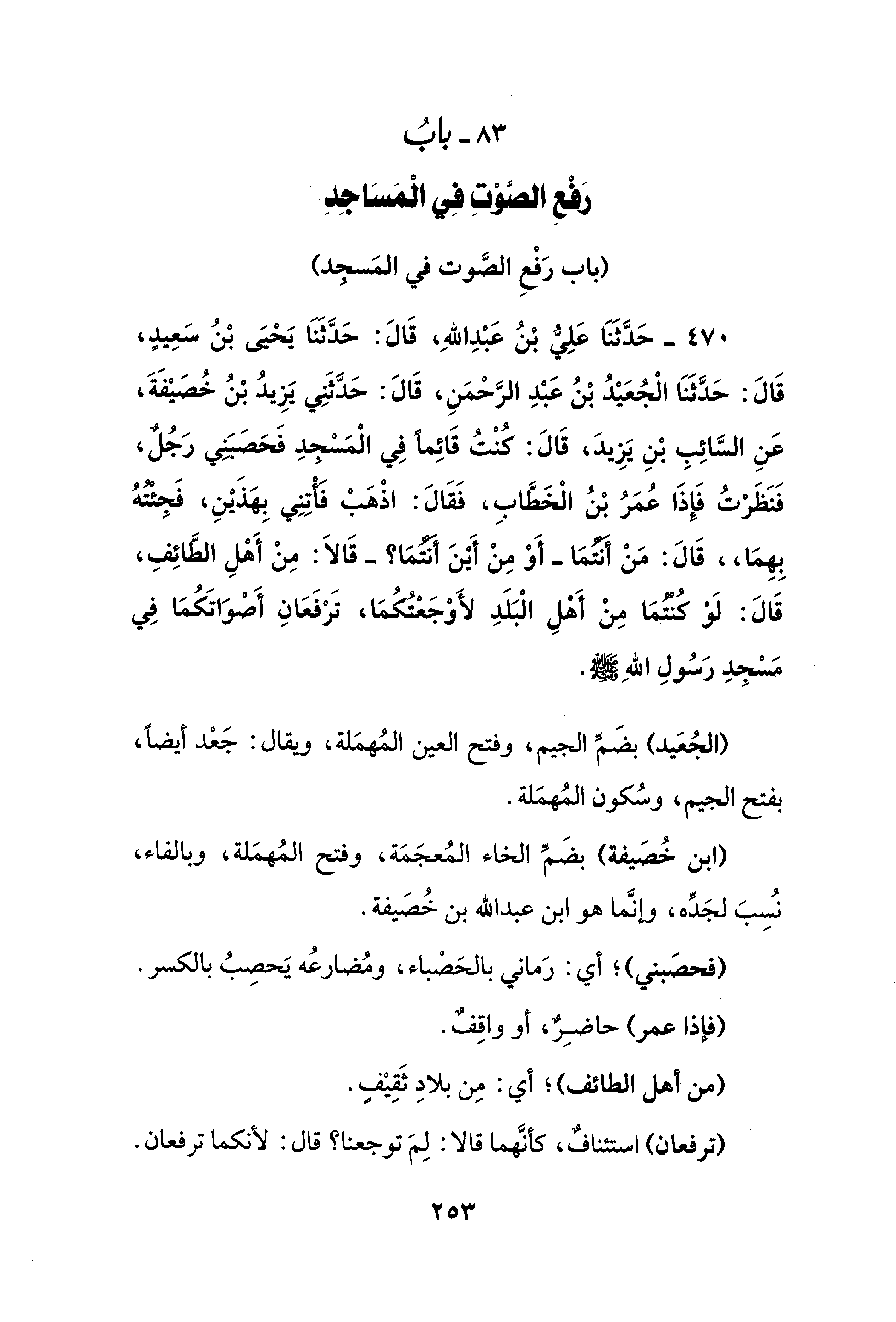 470 - حَدَّثَنَا عَلِيُّ بْنُ عَبْدِ اللهِ، قَالَ: حَدَّثَنَا يَحْيَى بْنُ سَعِيدٍ، قَالَ: حَدَّثَنَا الْجُعَيْدُ بْنُ عَبْدِ الرَّحْمَنِ، قَالَ: حَدَّثَنِي يَزِيدُ بْنُ خُصَيْفَةَ، عَنِ السَّائِبِ بْنِ يَزِيدَ، قَالَ: كُنْتُ قَائِمًا في الْمَسْجدِ فَحَصَبَنِي رَجلٌ، فَنَظَرْتُ فَإِذَا عُمَرُ بْنُ الْخَطَّابِ، فَقَالَ: اذْهَبْ فَأتِنِي بِهَذَيْنِ، فَجئتهُ بِهِمَا, قَالَ: مَنْ أنتمَا -أَوْ مِنْ أَيْنَ أنتمَا؟ - قَالاَ: مِنْ أَهْلِ الطَّائِفِ، قَالَ: لَوْ كنتمَا مِنْ أَهْلِ الْبَلَدِ لأَوْجَعْتُكُمَا، تَرْفَعَانِ أَصْوَاتَكُمَا في مَسْجدِ رَسُولِ اللهِ - صلى الله عليه وسلم -.