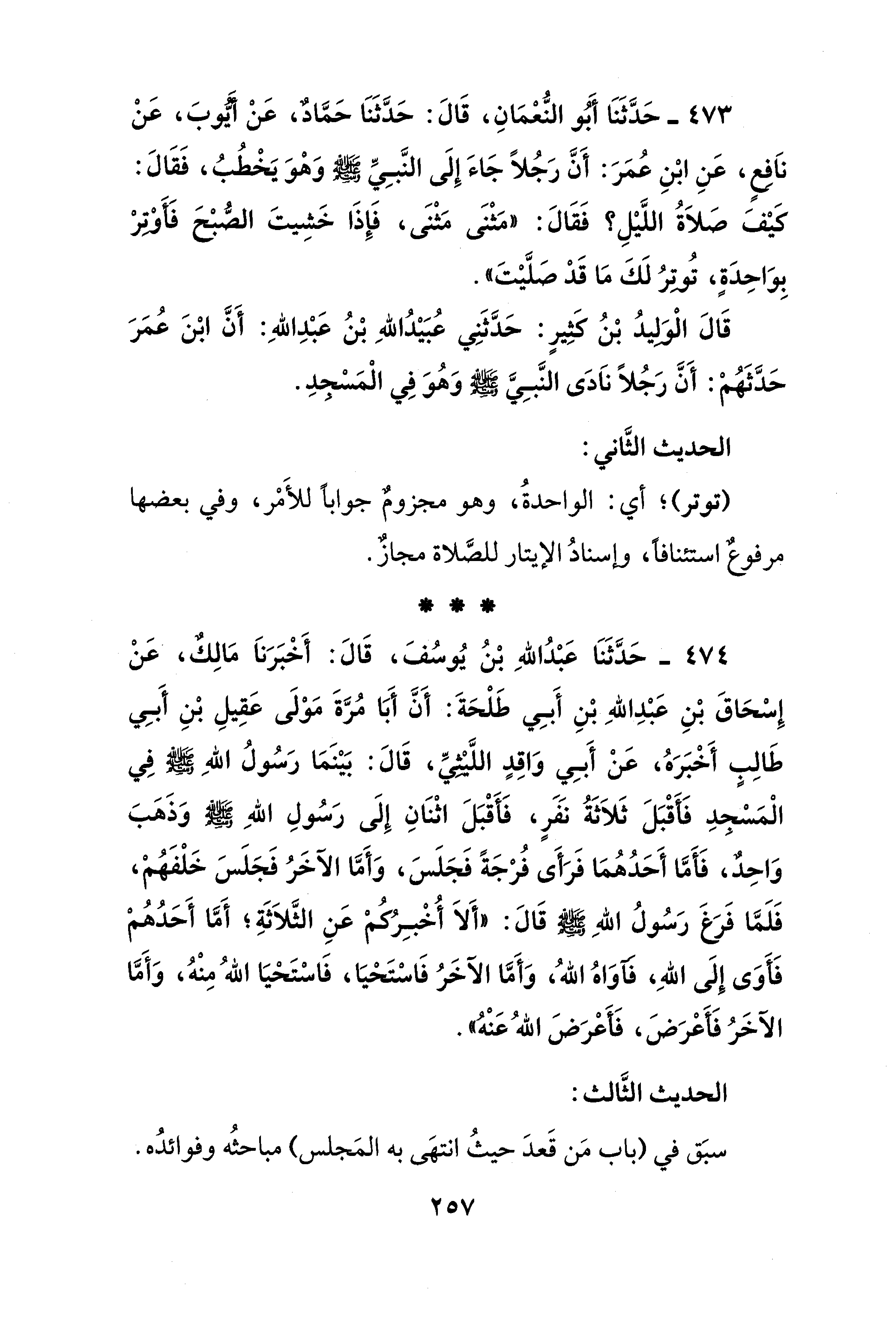 473 - حَدَّثَنَا أبو النُّعْمَانِ، قَالَ: حَدَّثَنَا حَمَّاد، عَنْ أيُّوبَ، عَنْ نافِعٍ، عَنِ ابْنِ عُمَرَ: أَنَّ رَجُلًا جَاءَ إِلَى النَّبِيِّ - صلى الله عليه وسلم - وَهْوَ يَخْطُبُ، فَقَالَ: كَيْفَ صَلاَةُ اللَّيْلِ؟ فَقَالَ: "مَثْنَى مَثْنَى، فَإِذَا خَشِيتَ الصُّبْحَ فَأوتِرْ بِوَاحِدَةٍ، تُوتِرُ لَكَ مَا قَدْ صلَّيْتَ".
