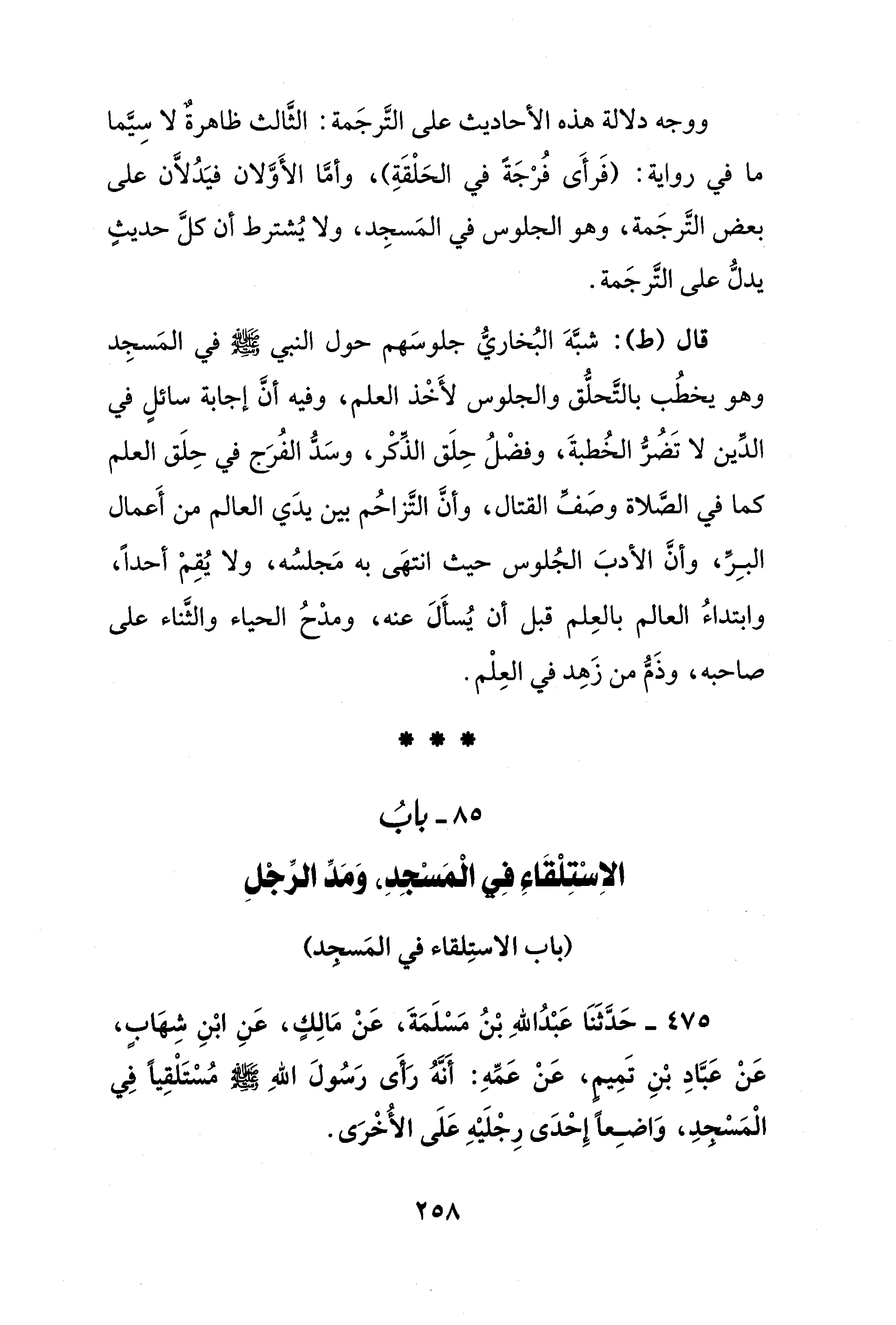 ووجه دلالة هذه الأحاديث على التَّرجَمة: الثَّالث ظاهرةٌ لا سِيَّما ما في رواية: (فَرأَى فُرْجَةً في الحَلْقَةِ)، وأمَّا الأَوَّلان فيَدُلَّان على بعض التَّرجَمة، وهو الجلوس في المَسجِد، ولا يُشترط أن كلَّ حديثٍ يدلُّ على التَّرجَمة.