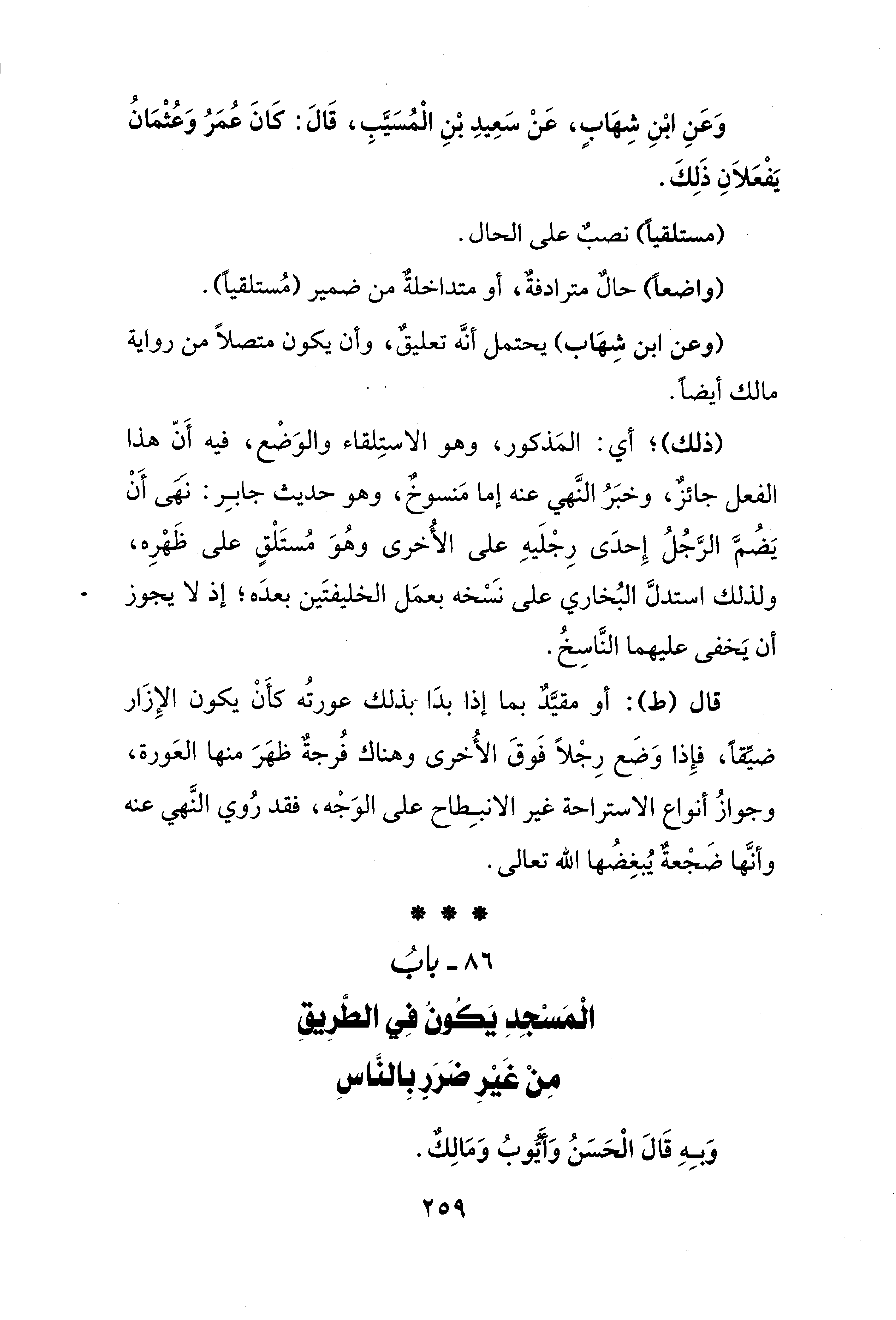 قال (ط): أو مقيَّدٌ بما إذا بدَا بذلك عورتُه كأَنْ يكون الإِزَار ضيِّقًا، فإِذا وَضَع رِجْلا فَوقَ الأُخرى وهناك فُرجةٌ ظهَرَ منها العَورة، وجوازُ أنواع الاستراحة غير الانبِطاح على الوَجْه، فقد رُوي النَّهي عنه وأنَّها ضَجْعةٌ يُبغِضُها الله تعالى.