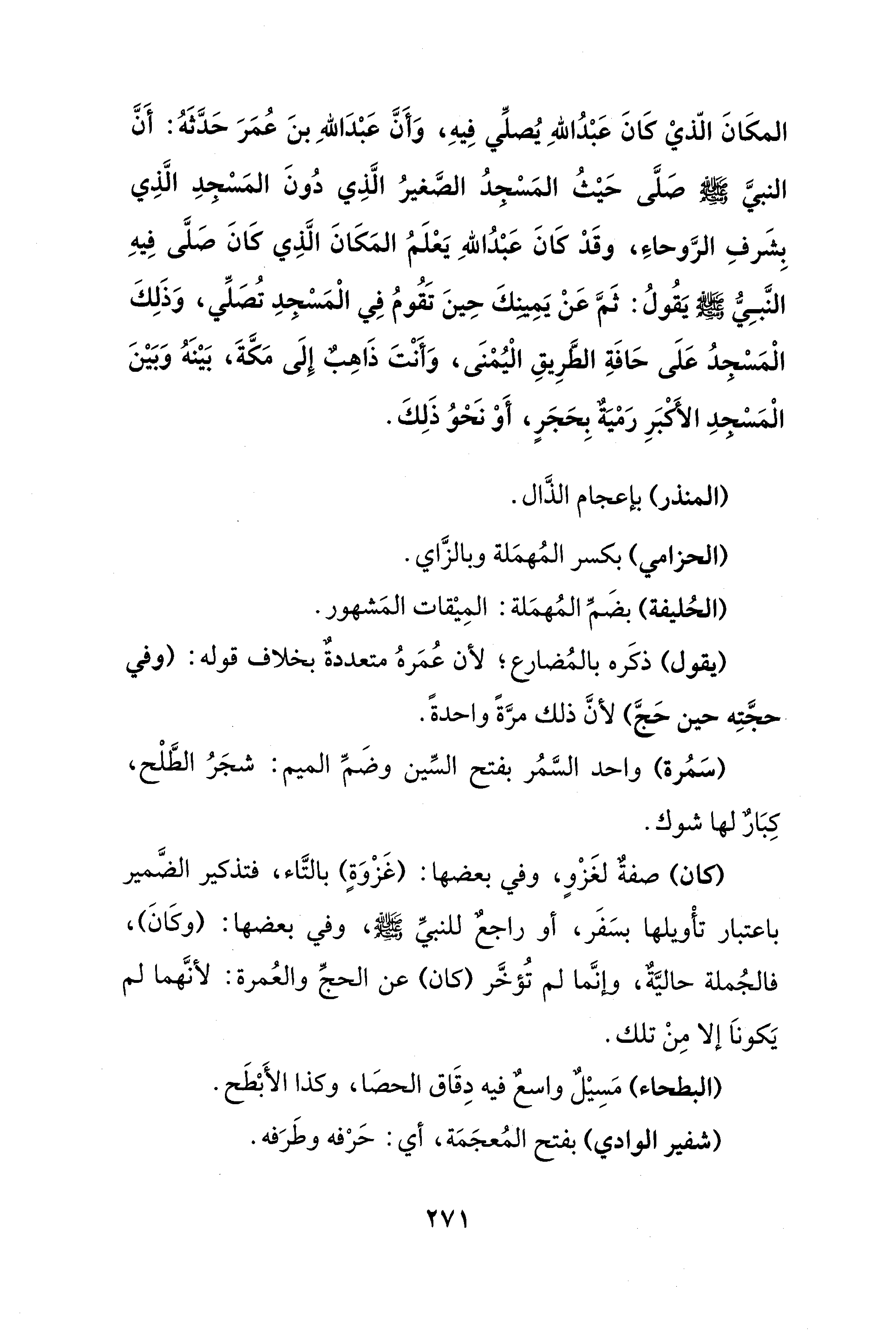 المكَانَ الّذي كَانَ عَبْدُ اللهِ يُصلِّي فِيهِ، وَأَنَّ عَبْدَ اللهِ بنَ عُمَرَ حَدَّثَهُ: أَنَّ النبيَّ - صلى الله عليه وسلم - صَلَّى حَيْثُ المَسْجدُ الصَّغيرُ الَّذِي دُونَ المَسْجدِ الَّذِي بِشَرفِ الرَّوحاءَ، وقَدْ كَانَ عَبْدُ اللهِ يَعْلَمُ المَكَانَ الَّذِي كَانَ صلَّى فِيهِ النَّبِيُّ - صلى الله عليه وسلم - يَقُولُ: ثَمَّ عَنْ يَمِينكَ حِينَ تَقُومُ في الْمَسْجدِ تُصَلِّي، وَذَلِكَ الْمَسْجدُ عَلَى حَافَةِ الطَّرِيقِ الْيُمْنَى، وَأنتَ ذَاهِب إِلَى مَكَّةَ، بَيْنَهُ وَبَيْنَ الْمَسْجِدِ الأكبَرِ رَمْيَةٌ بِحَجَرٍ، أَوْ نَحْوُ ذَلِكَ.