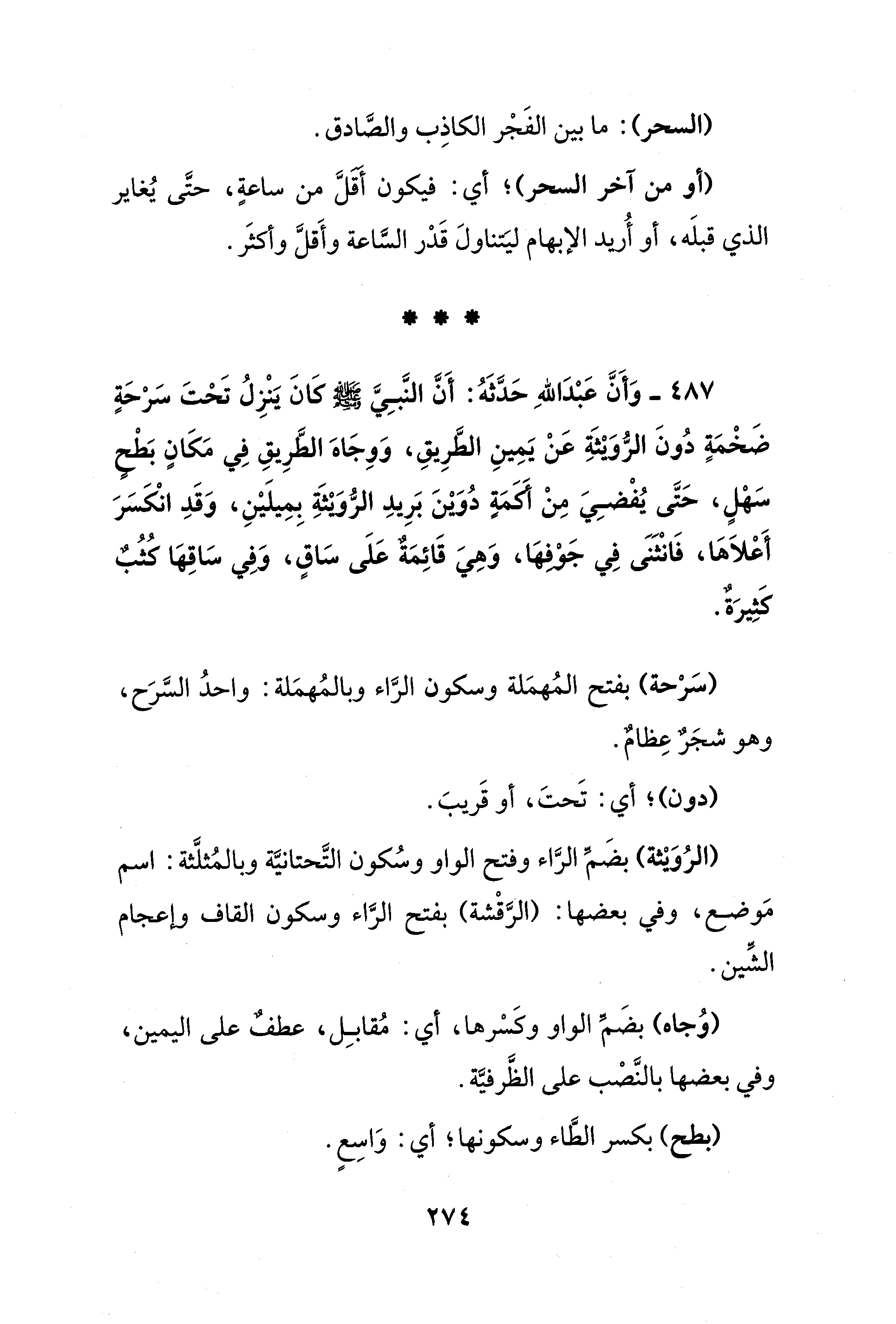 487 - وَأَنَّ عَبْدَ اللهِ حَدَّثَهُ: أَنَّ النَّبِيَّ - صلى الله عليه وسلم - كانَ يَنْزِلُ تَحْتَ سَرْحَةٍ ضَخْمَةٍ دُونَ الرُّويثَةِ عَنْ يَمِينِ الطَّرِيقِ، وَوِجَاهَ الطَّرِيقِ في مَكَانٍ بَطْحٍ سَهْلٍ، حَتَّى يُفْضِيَ مِنْ أكمَةٍ دُوَيْنَ بَرِيدِ الرُّويثَةِ بِمِيلَيْنِ، وَقَدِ انْكَسَرَ أَعْلاَهَا، فَانْثنى في جَوْفهَا، وَهِيَ قَائِمَةٌ عَلَى سَاقٍ، وَفِي سَاقِهَا كُثُبٌ كَثِيرَةٌ.