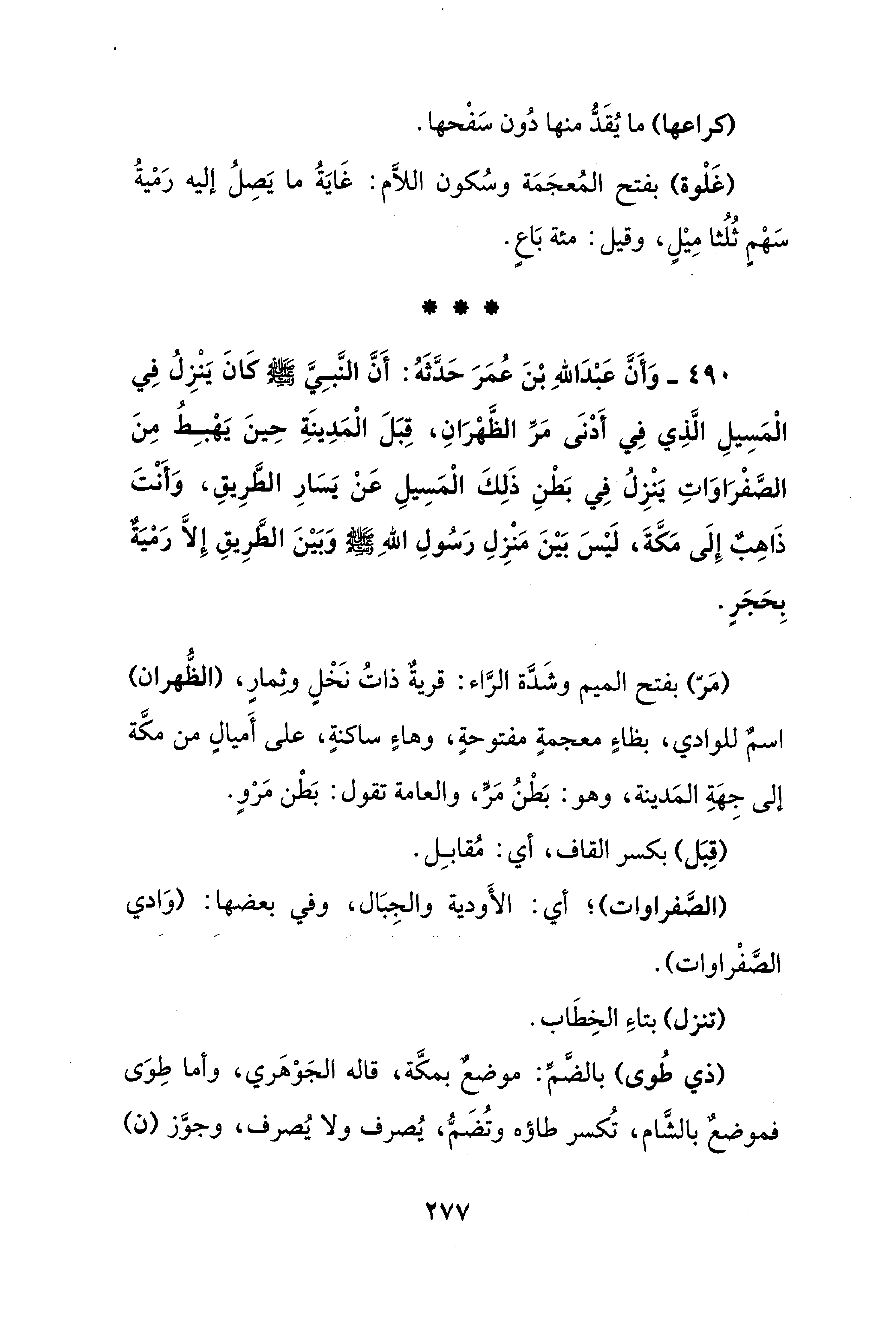 490 - وَأَنَّ عَبْدَ اللهِ بْنَ عُمَرَ حَدَّثَهُ: أَنَّ النَّبِيَّ - صلى الله عليه وسلم - كَانَ يَنْزِلُ في الْمَسِيلِ الَّذِي في أَدْنَى مَرِّ الظَّهْرَانِ، قِبَلَ الْمَدِينَةِ حِينَ يَهْبِطُ مِنَ الصَّفْرَاوَاتِ يَنْزِلُ في بَطْنِ ذَلِكَ الْمَسِيلِ عَنْ يَسَارِ الطَّرِيقِ، وَأَنْتَ ذَاهِبٌ إِلَى مَكَّةَ، لَيْسَ بَيْنَ مَنْزِلِ رَسُولِ اللهِ - صلى الله عليه وسلم - وَبَيْنَ الطَّرِيقِ إِلَّا رَمْيَةٌ بِحَجَرٍ.