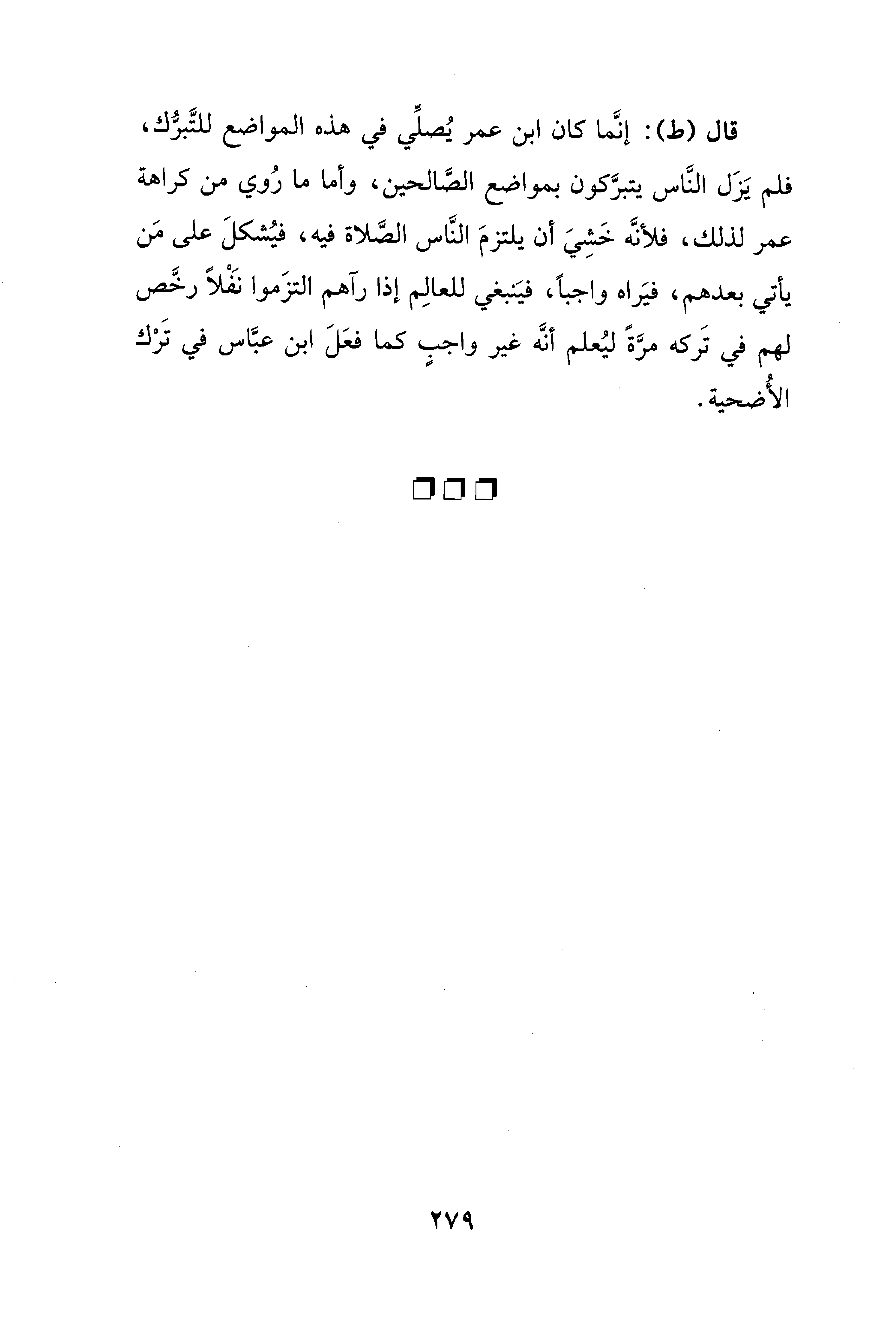 قال (ط): إنَّما كان ابن عمر يُصلِّي في هذه المواضع للتَّبرُّك، فلم يَزَل النَّاس يتبرَّكون بمواضع الصَّالحين، وأما ما رُوي من كراهة عمر لذلك، فلأنَّه خَشِيَ أن يلتزمَ النَاس الصَّلاة فيه، فيُشكلَ على مَن يأتي بعدهم، فيَراه واجبًا، فيَنبغي للعالِم إذا رآهم التزَموا نَفْلًا رخَّص لهم في تَركه مرَّةً ليُعلم أنَّه غير واجبٍ كما فعَلَ ابن عبَّاس في تَرْك الأُضحية.
