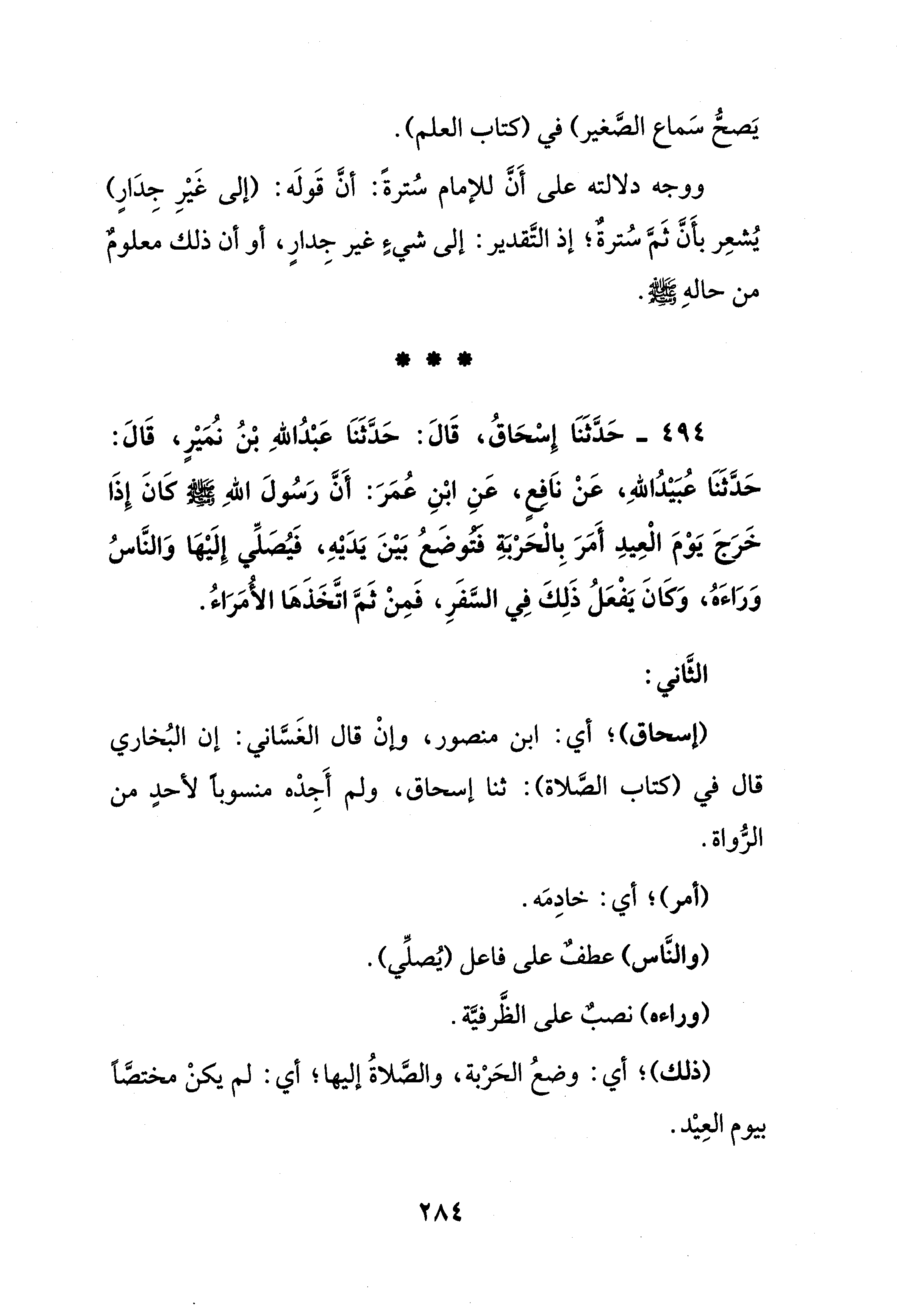 494 - حَدَّثَنَا إِسْحَاقُ، قَالَ: حَدَّثَنَا عَبْدُ اللهِ بْنُ نُمَيْرٍ، قَالَ: حَدَّثَنَا عُبَيْدُ اللهِ، عَنْ ناَفِعٍ، عَنِ ابْنِ عُمَرَ: أَنَّ رَسُولَ اللهِ - صلى الله عليه وسلم - كَانَ إِذَا خَرَجَ يَوْمَ الْعِيدِ أَمَرَ بِالْحَرْبَةِ فَتُوضَعُ بَيْنَ يَدَيْهِ، فَيُصَلِّي إِلَيْهَا وَالنَّاسُ وَرَاءَهُ، وَكَانَ يَفْعَلُ ذَلِكَ في السَّفَرِ، فَمِنْ ثَمَّ اتَّخَذَهَا الأُمَرَاءُ.